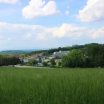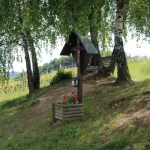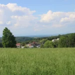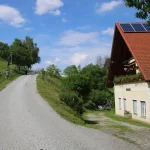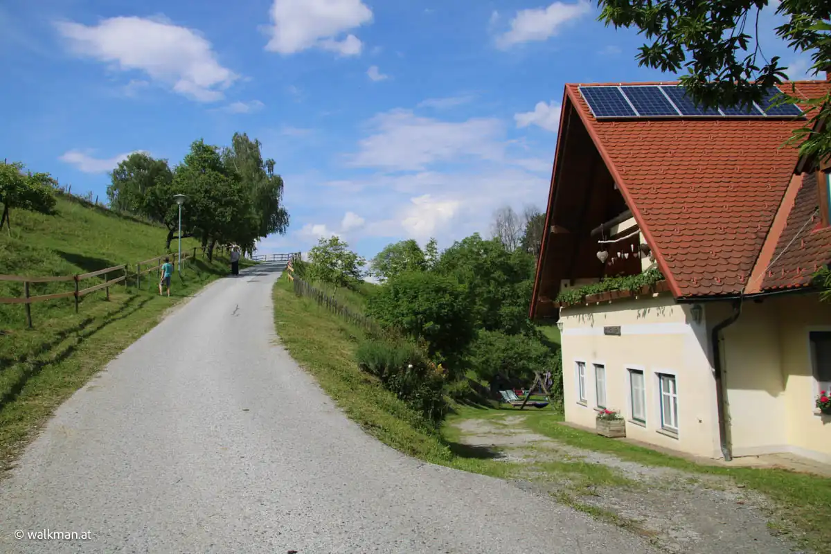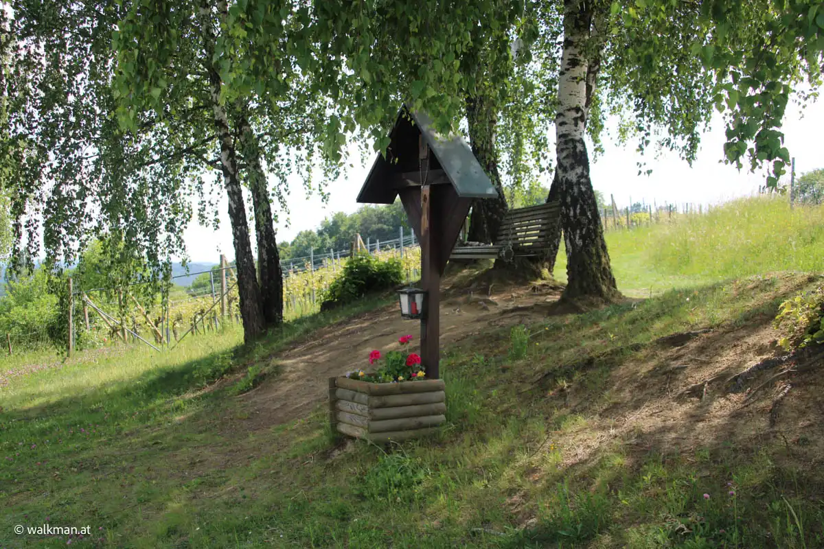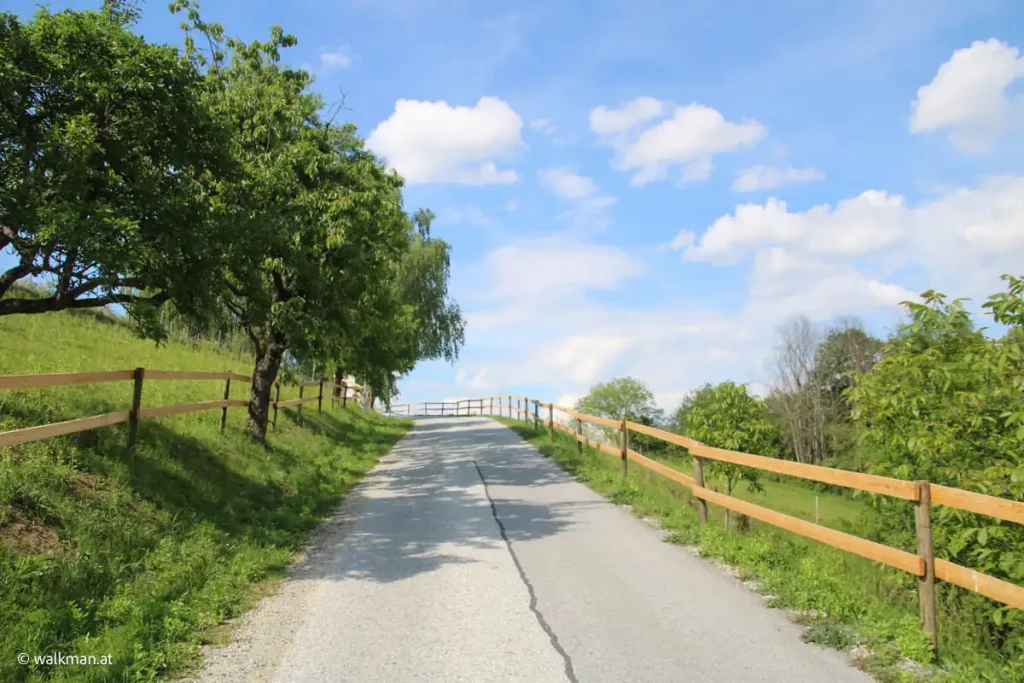 Wir wandern an schmucken Häusern entlang, an weiteren Bäumen, vorbei, den Hang hinauf. Das letzte Stück hat etwas von einem „Weg in den Himmel“. Kein Ende in Sicht, nur das schöne Blau-Weiß des wolkenbetupften Himmels am heutigen Tag. Auch ein Marterl findet man hier am Wegesrand.