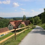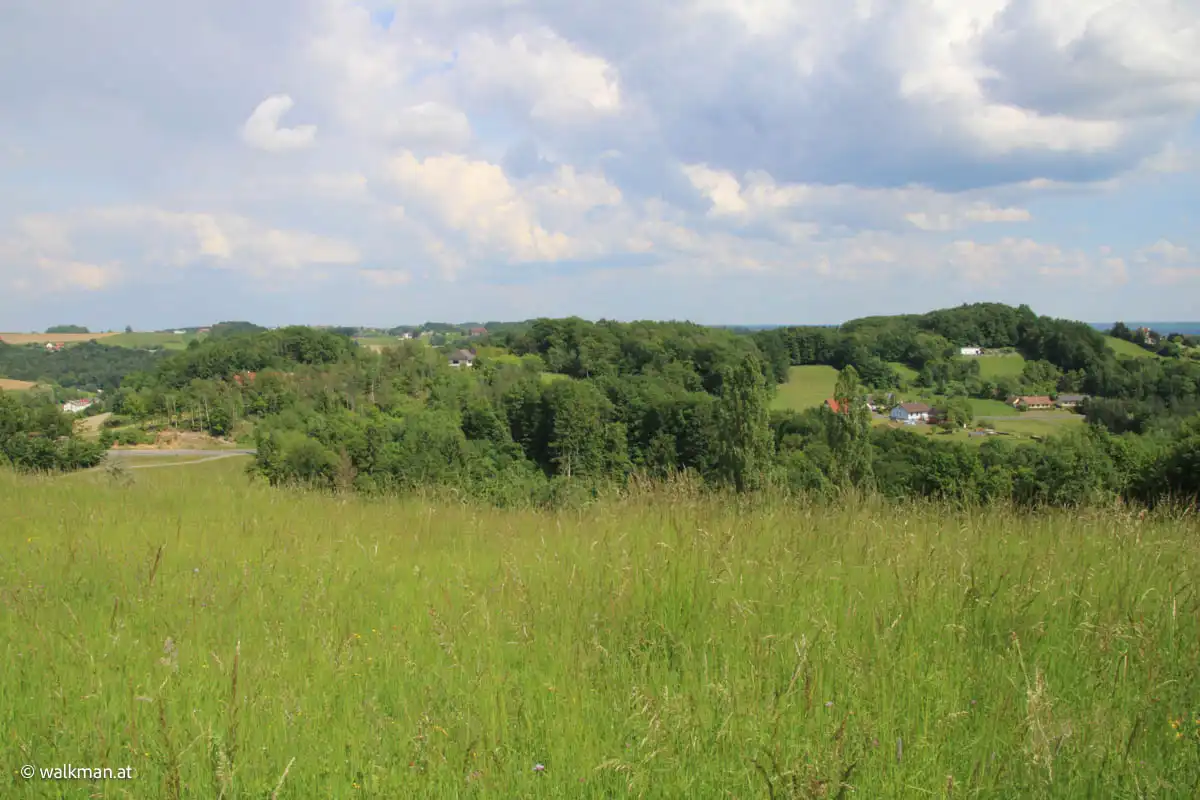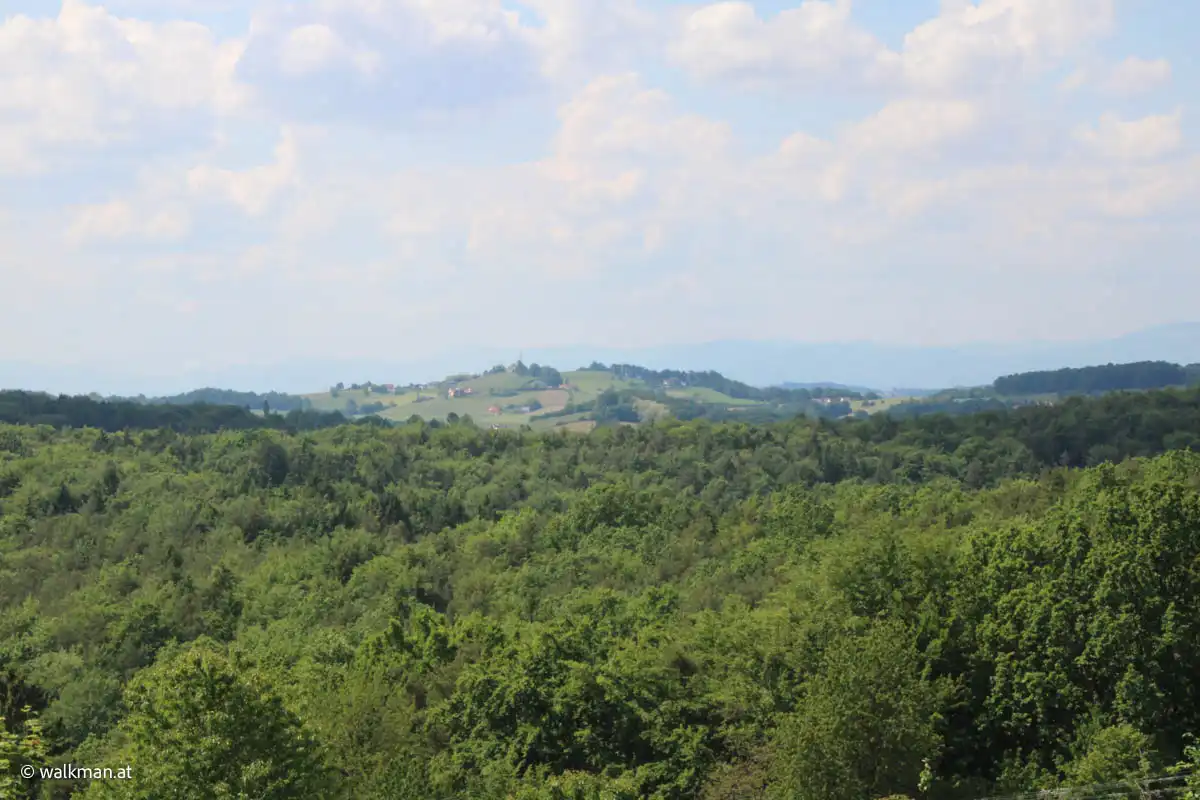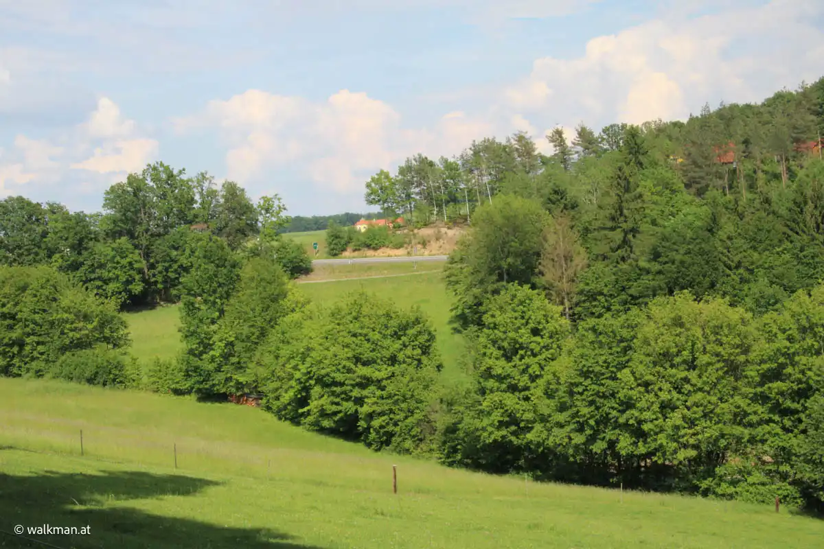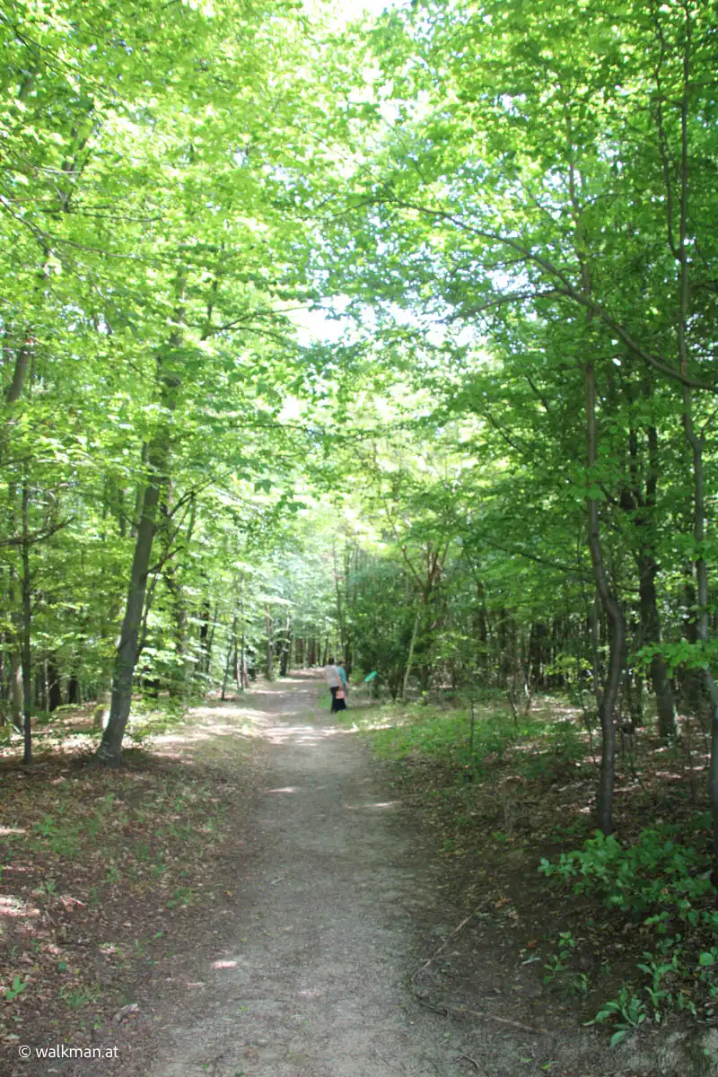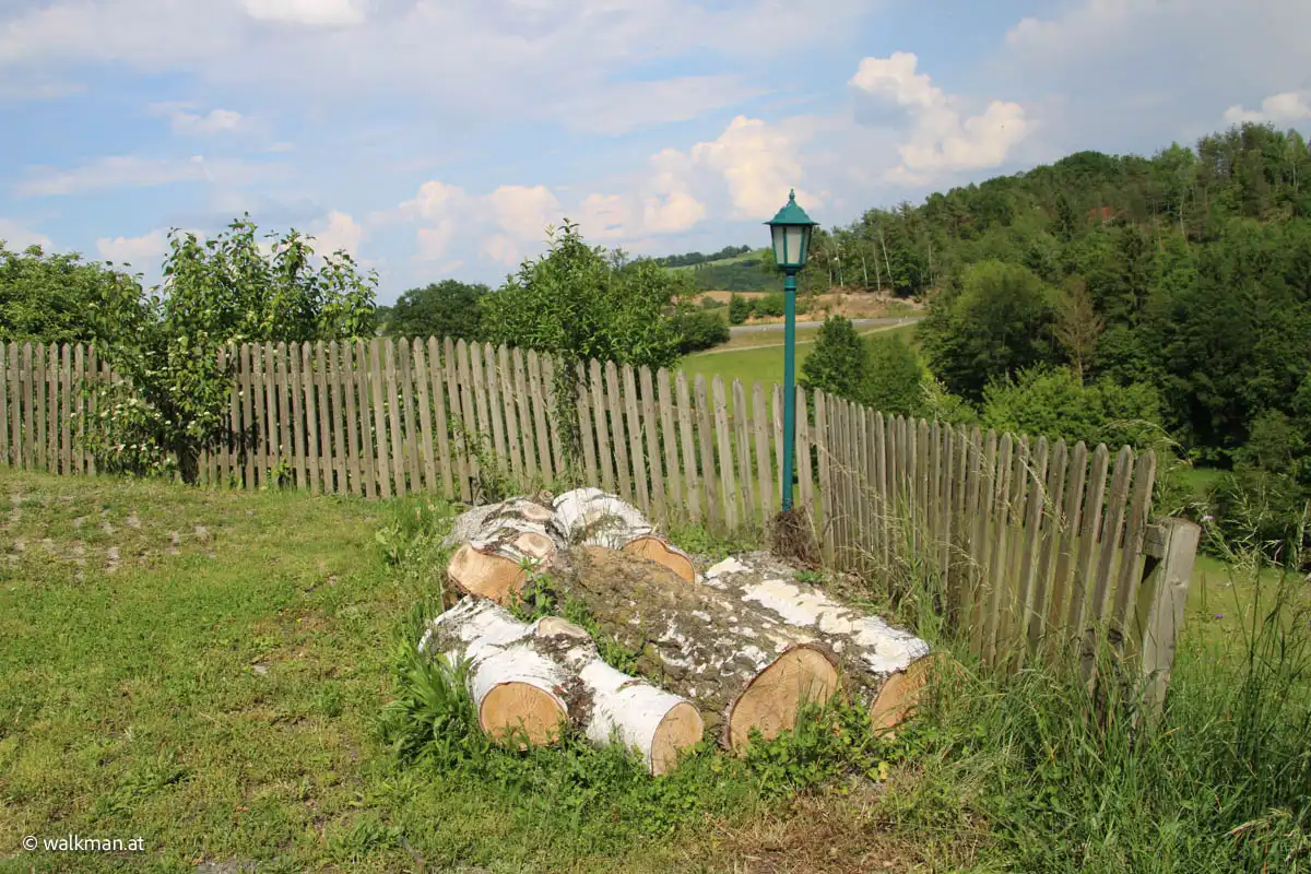 Der Startpunkt des Themenweges ist ja eigentlich bei der Therme Loipersdorf. Wir sind den Weg aber als Family-Nachmittagsausflug gegangen. Und haben uns deswegen einen Punkt weiter oben, in der Nähe des „ersten Baumes“, gesucht. Außerdem wollten wir nach der Tour auch einkehren, also war der Parkplatz, den wir hier oben, vor „Riegler’s Buschenschank“ gefunden hatten, bestens dazu geeignet