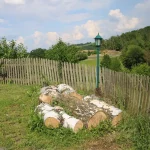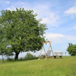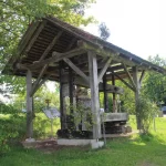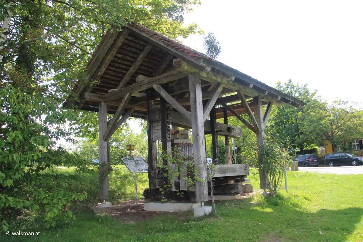 Hier steht auch der letzte Baum des Baumkreises. Und eine alte Wein- bzw.- Obstpresse. Außerdem hat man von hier einen schönen Blick auf das, im Tal darunter liegende, Areal der Therme Loipersdorf.
