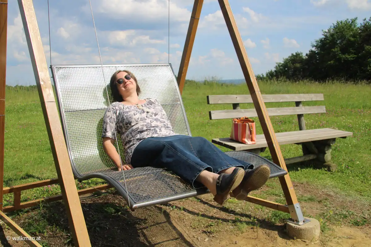 Der Rundweg ist grundsätzlich angenehm zu gehen. Die erste Hälfte führt durchwegs bergab. Gleich zu Beginn lädt eine Sitzgruppe und Schaukel mit herrlicher Aussicht zu einer Pause ein. Wir sind aber eben erst gestartet. Egal. Zu schön, um nicht zu rasten.