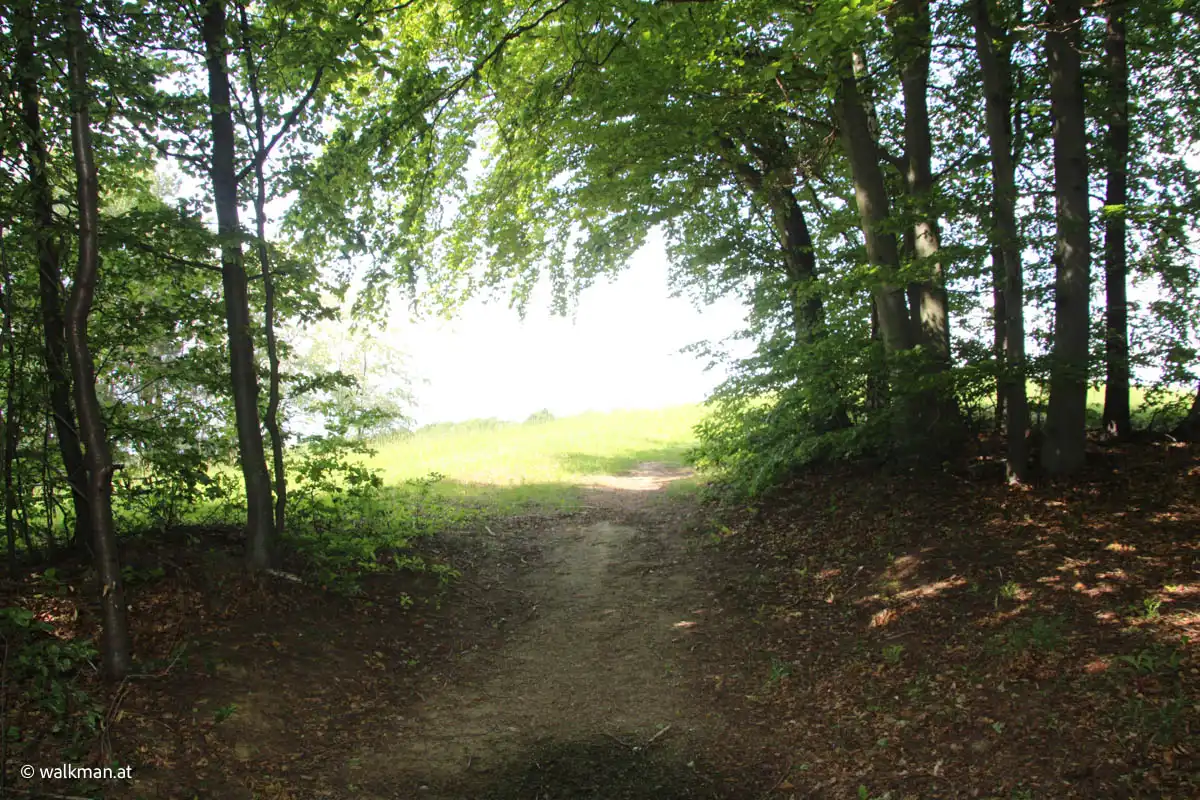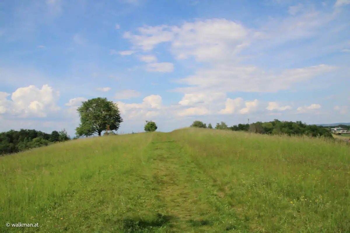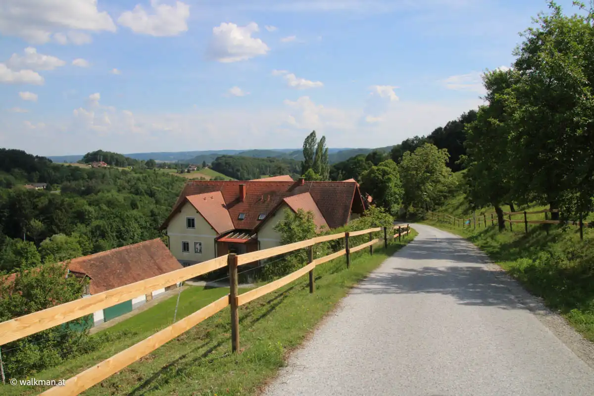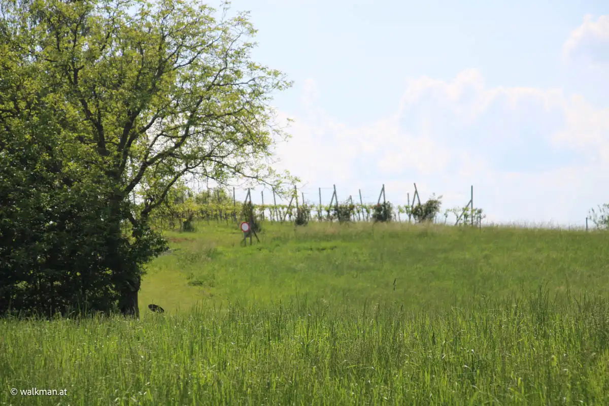 Nach ein paar Minuten Pause und wieder zu Kräften kommen, nehmen wir das letzte, finale Stück des Weges in Angriff. Jetzt nur noch den Feldweg entlang, quer über den Hang, Richtung Buschenschank.
