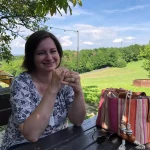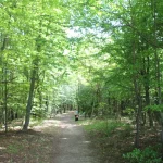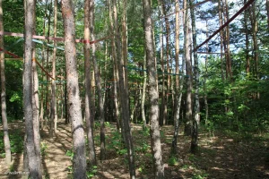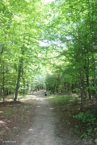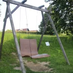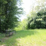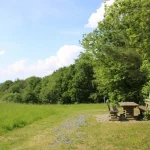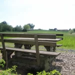 Abermals ein Stück weiter kommen wir zu einem Waldstück. Hier links entlang am Waldrand. Die hier wartende Sitzgruppe wird aber nun von uns Erwachsenen in Anspruch genommen. Während Junior, im Wald dahinter, das hier installierte „Baum-Labyrinth“ erkundet.