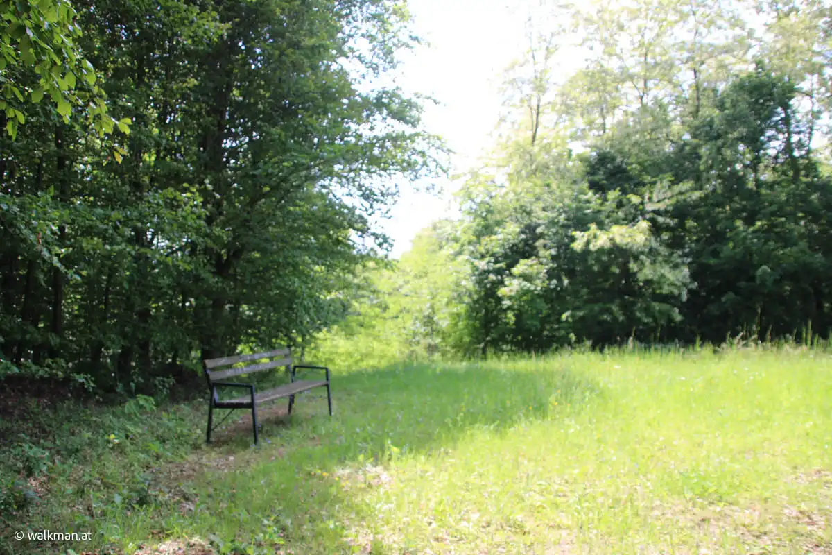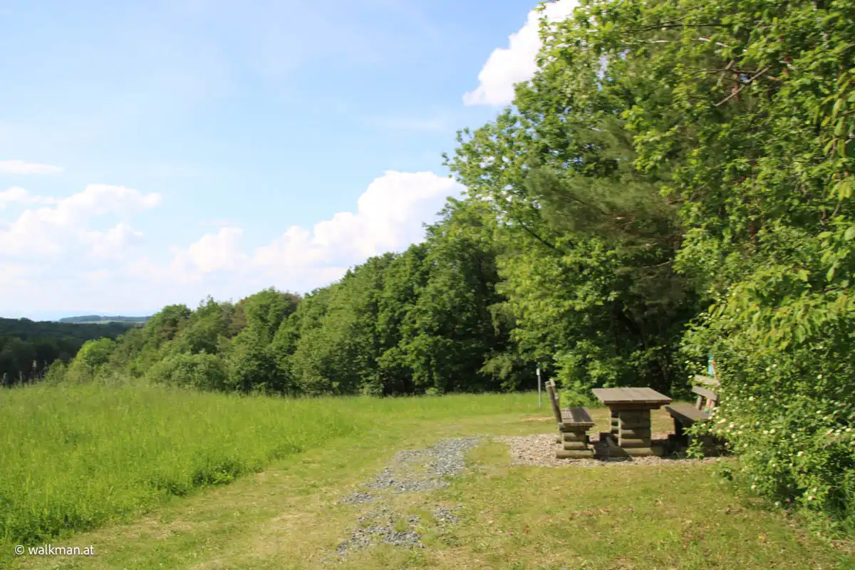 Oben angekommen lädt zur linken Hand eine weitere Sitzgruppe, im Schatten eines Baumes, zum Rasten ein. Tun wir aber nicht. Jetzt freuen wir uns schon auf den Kaffee nachher, im Buschenschank.