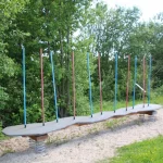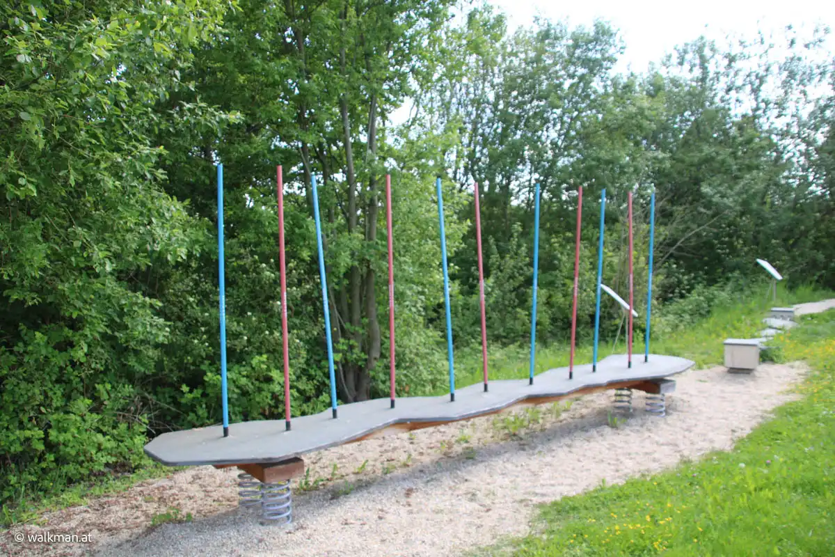 Am höchsten Punkt halten wir uns rechts und wandern bei ein paar Stationen eines Motorikparks vorbei. Einem „Hängenden Golfplatz“ und einer „Holzwelle“. Beides wird natürlich ausprobiert. Dabei merken wir: Wir werden nicht jünger.