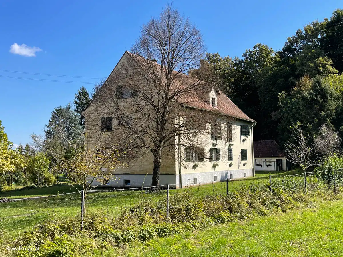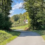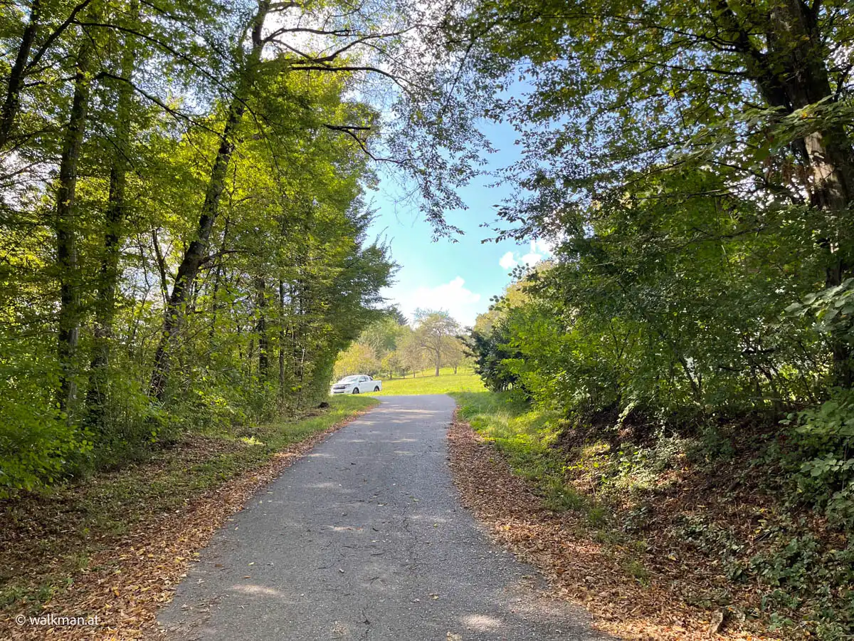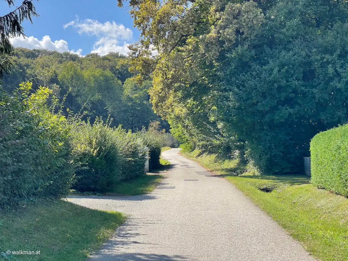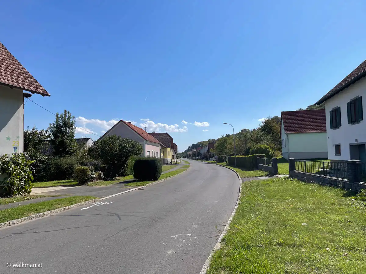 Am Ende des Ortes, kurz vor der Ortstafel führt dann eine Gasse rechts hinein. Hier verläuft unsere Route weiter. Nun aber ansteigend. Quasi der Startschuss zur „Hochberg-Besteigung“. An zwei alten Zinshäusern vorbei, die vermutlich noch aus der Kriegs- oder Nachkriegszeit stammen, spazieren wir nach hinten zum Wald.
