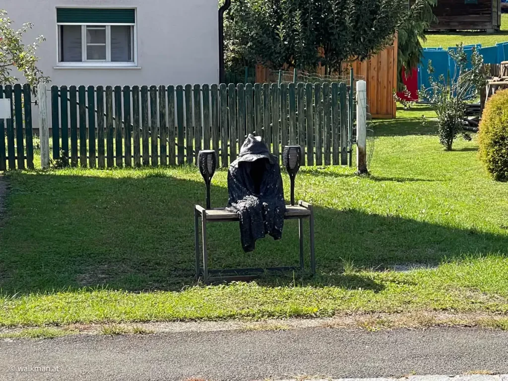 Wir spazieren weiter nach unten, an der Feuerwehr vorbei, bis zur Hauptstraße. Hier halten wir und rechts und wandern am Gehsteig bis zum Ortsende von Heiligenbrunn. Am Weg dorthin begegnen wir einem, wie soll ich es nennen, „Schrei“? Viele kennen ja sicher die Figur aus „Scary Movie“ (und/oder „Scream“?). Die mit dem Umhang.