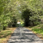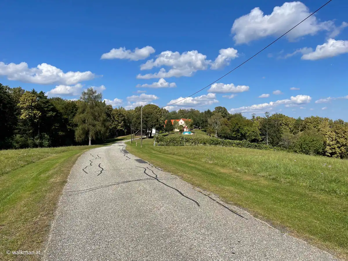 Zügig spazieren wir nun durch den Wald hindurch, bei einer zuerst Links- dann Rechtskurve und einem weiteren Gehöft vorbei, abermals eine lange Gerade bergab entlang. Zwei Wanderer kommen uns entgegen. Wir grüßen uns, wie immer.