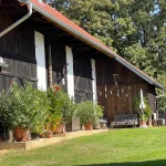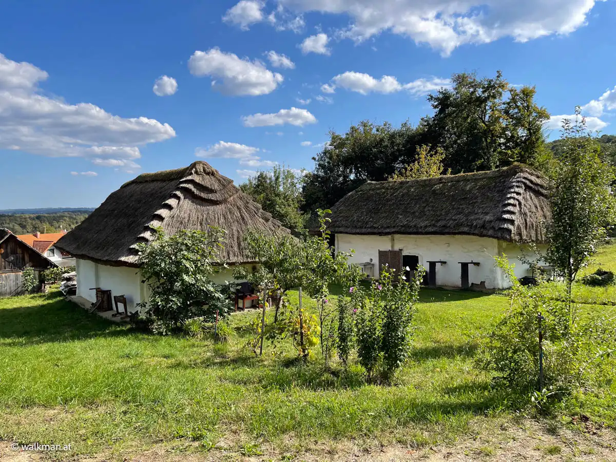 Einen weiteren Grund zur Freude, zumindest fürs Auge, erfahren wir kurze zeit später. Bevor wir wieder in ein Waldstück hinein wandern, spazieren wir durch ein schmuckes Gehöft hindurch, das hier in einsamer Alleinlage liegt. Es ist sichtlich schon einige Jahre alt und Teile des Gehöfts haben sicher schon über 100 Jahre „am Buckel“ aber es ist sehr gepflegt und vollkommen intakt.