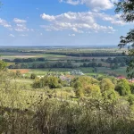 Hier finden wir die Aussicht, die wir zuvor vermisst hatten. Traumhaft. Aus dem Wald heraus tretend empfängt uns ein Panoramablick über Heiligenbrunn und die dahinter beginnende pannonische Tiefebene.