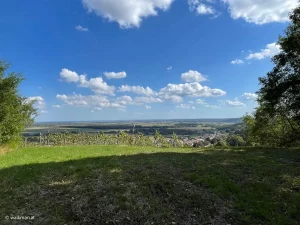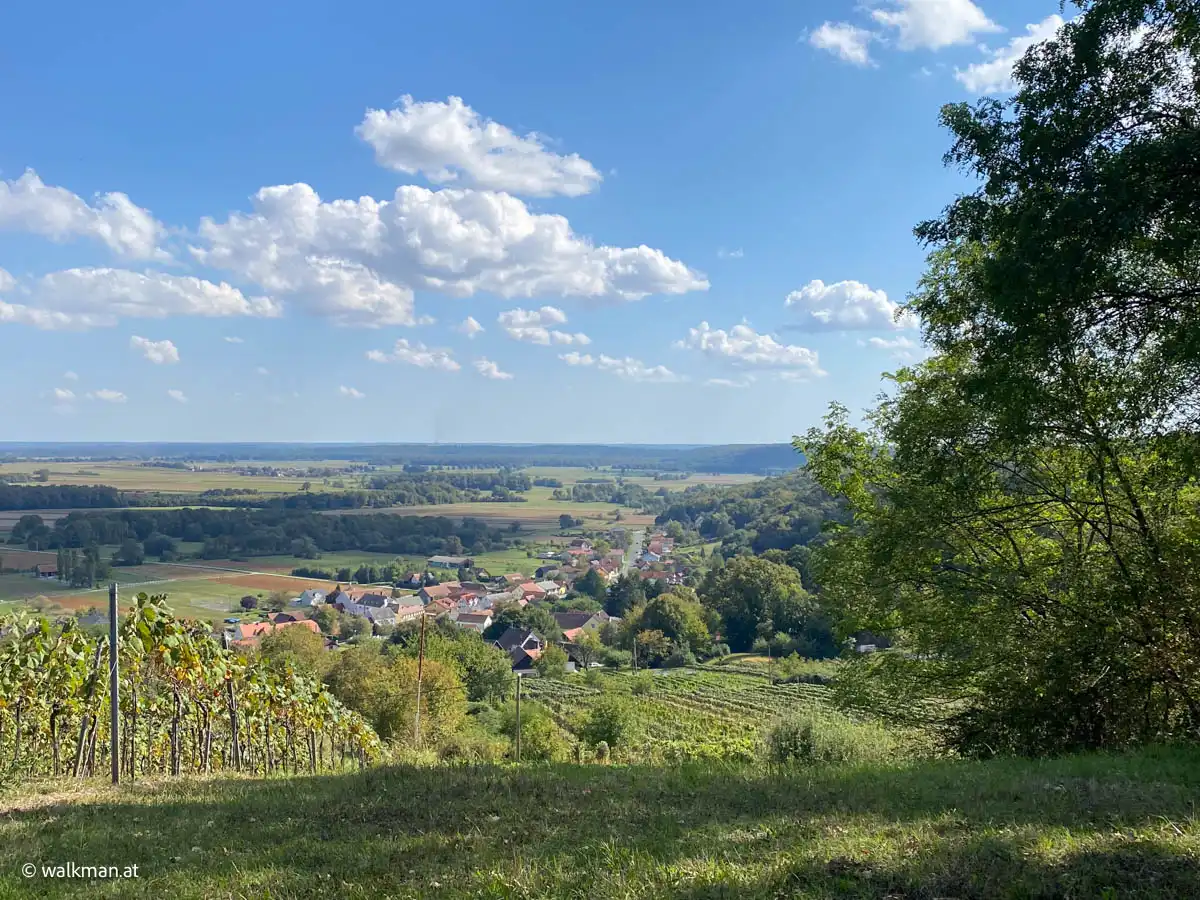 Von hier aus hat man auch einen wirklich schönen Panoramablick, in das Tal und die Straße nach Reinersdorf hinunter. Eingebettet in Weinberge, Wiesen und Wälder. Dies bei aktuell strahlendem Sonnenschein ergibt in Summe einen schönen, entspannten, glücklichen Augenblick. Ein Highlight des Tages.