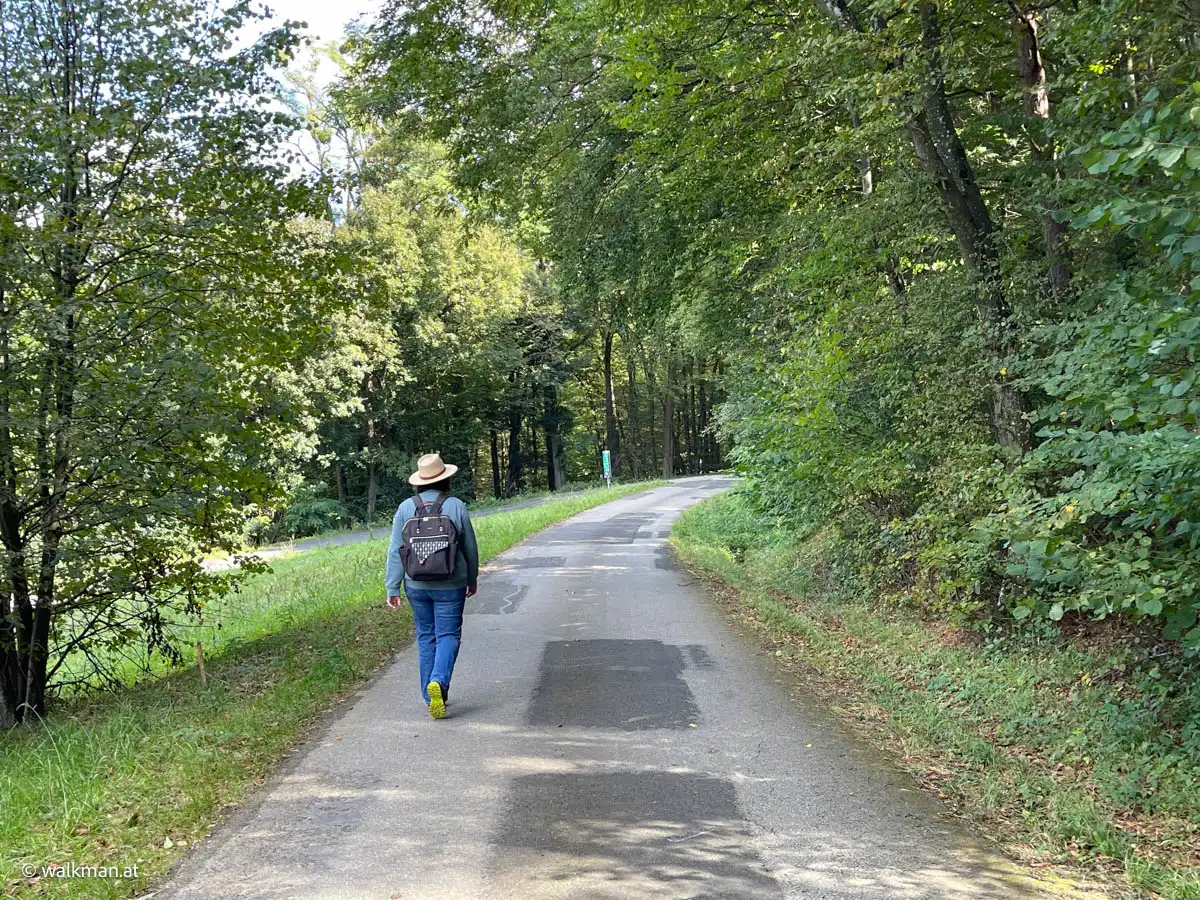 Und nun wieder rein in den schattigen Wald. Auf einer langen geraden Allee geht es nun nach Heiligenbrunn hinab. Und fast wären wir dran vorbei gewandert.