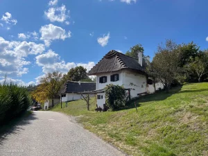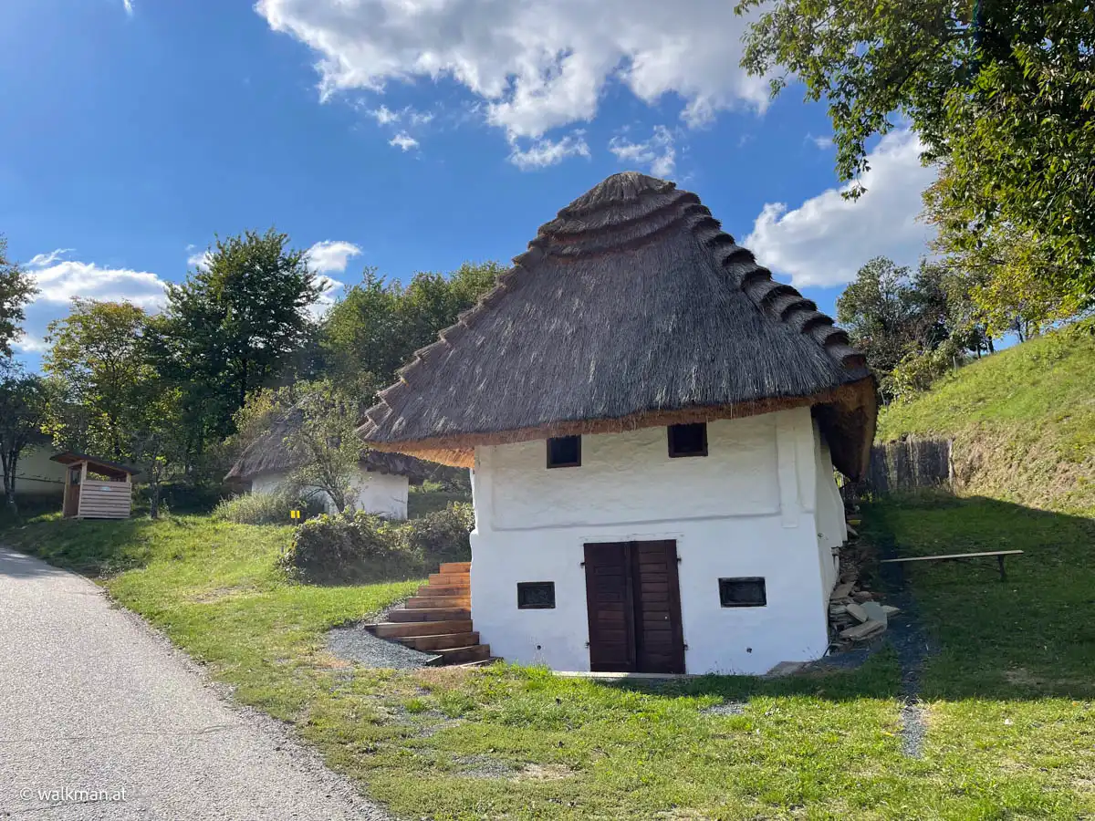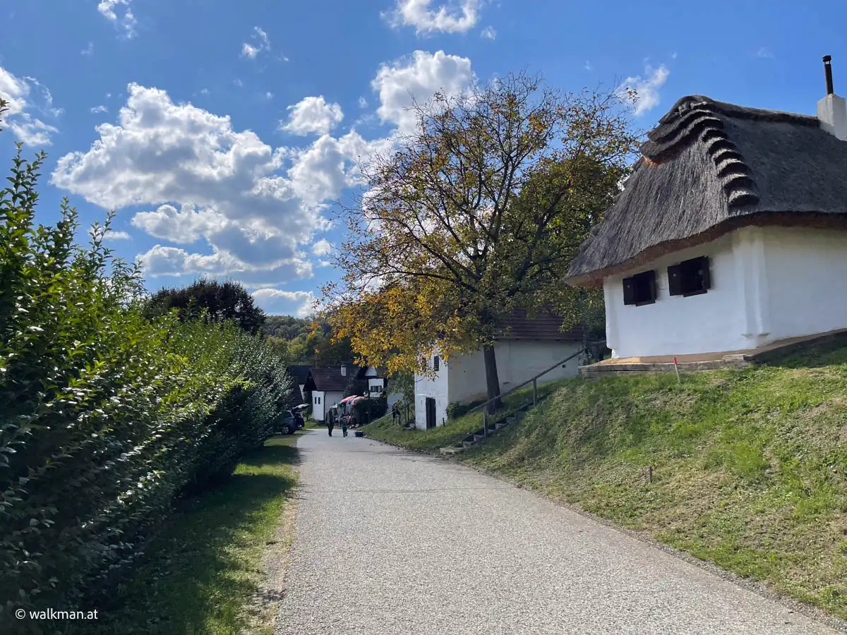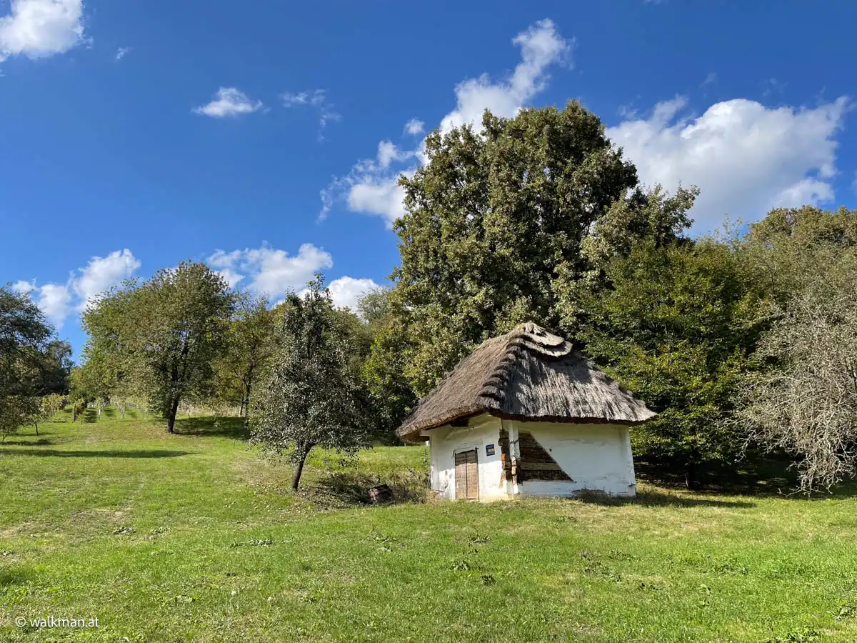Auf einer geschwungenen, serpentinenartigen Forststraße geht es nun durch ein kurzes Waldstück, stetig bergauf. Hier findet man auch bereits ein paar alte, schilfgedeckte Kellerstöckl, für die Heiligenbrunn auch bekannt ist. Viele Weitere sollten wir dann ja am Ende unserer Tour in der Kellergasse kennen lernen.