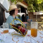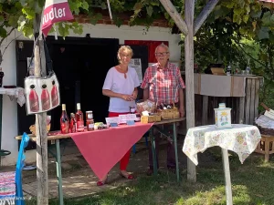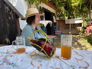 Warum auch nicht, beschließen wir beide nach kurzem Gespräch. Und „liefern uns dem Verkäufer aus“. In den nächsten 30 bis 45 Minuten erfahren wir viel über die Herstellung häuslicher Produkte, genießen einen „Weingarten-Pfirsich-Saft“ und lernen auch die Gattin des Mannes kennen.