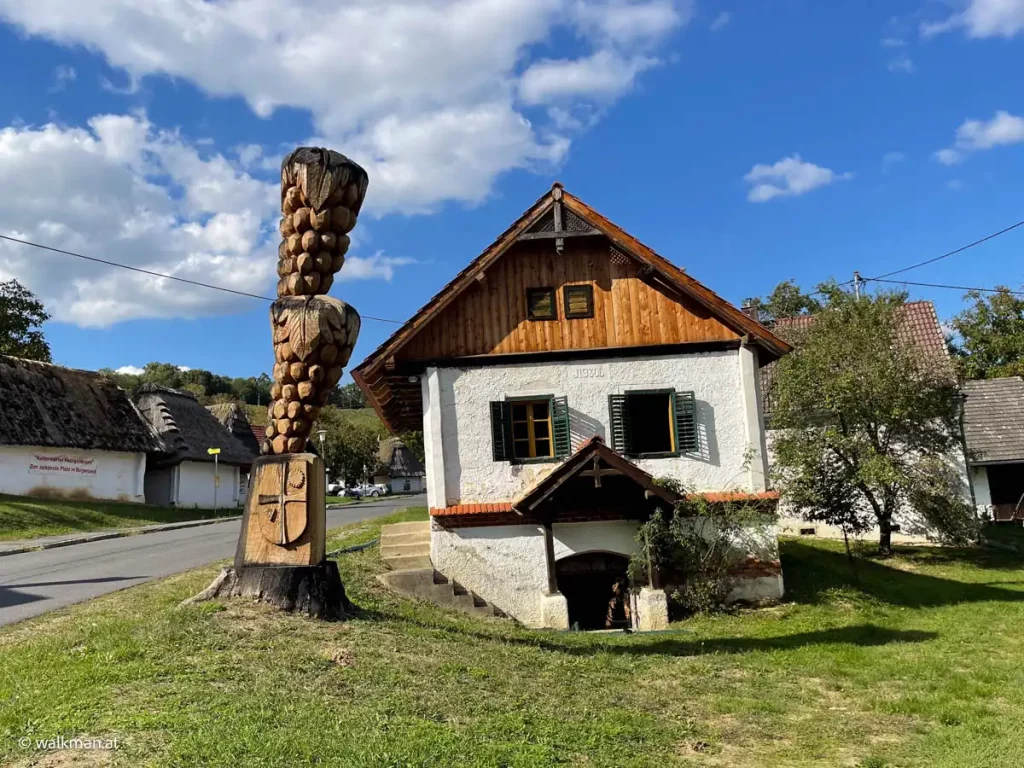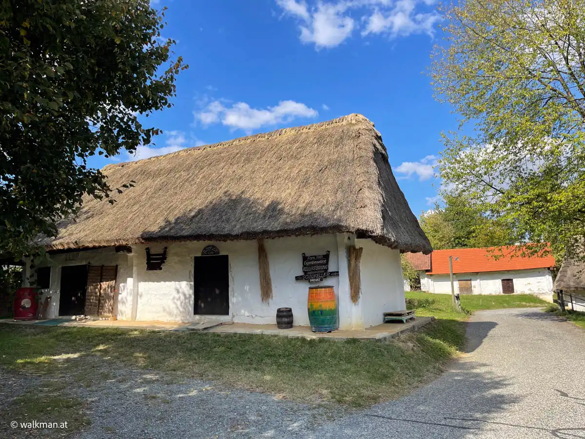 Die liebevollen Arrangements rund um die Kellerstöckl seien es nun alte Bänke oder Weinfässer oder andere Gerätschaften rund um den Weinbau, geben dem Gesamteindruck noch die letzte fehlende Nuance. Als ob die Zeit hier vor langer Zeit stehen geblieben ist. Zumindest wollen wir zwei das so empfinden, beim Durchwandern. Weil die parkenden E-Autos passen da irgendwie nicht dazu.