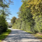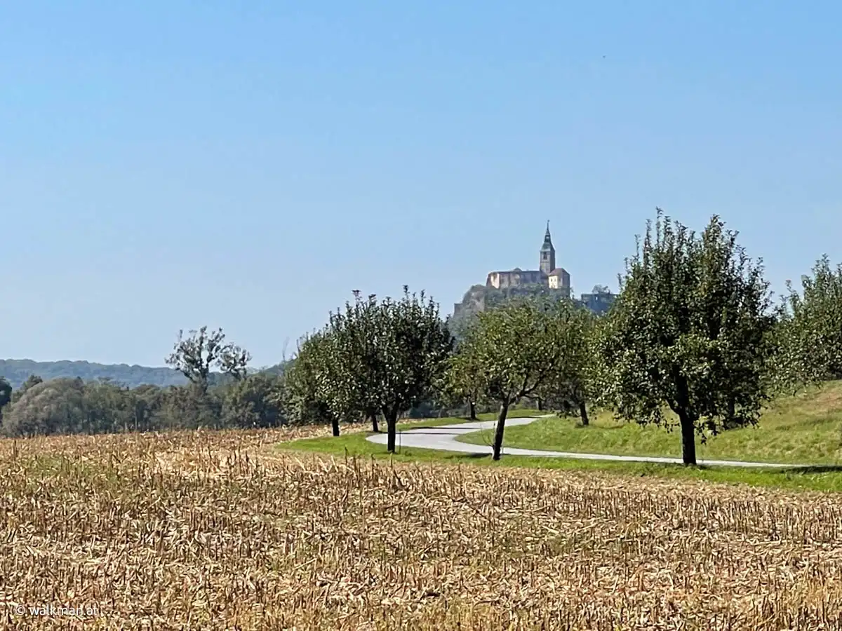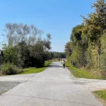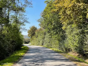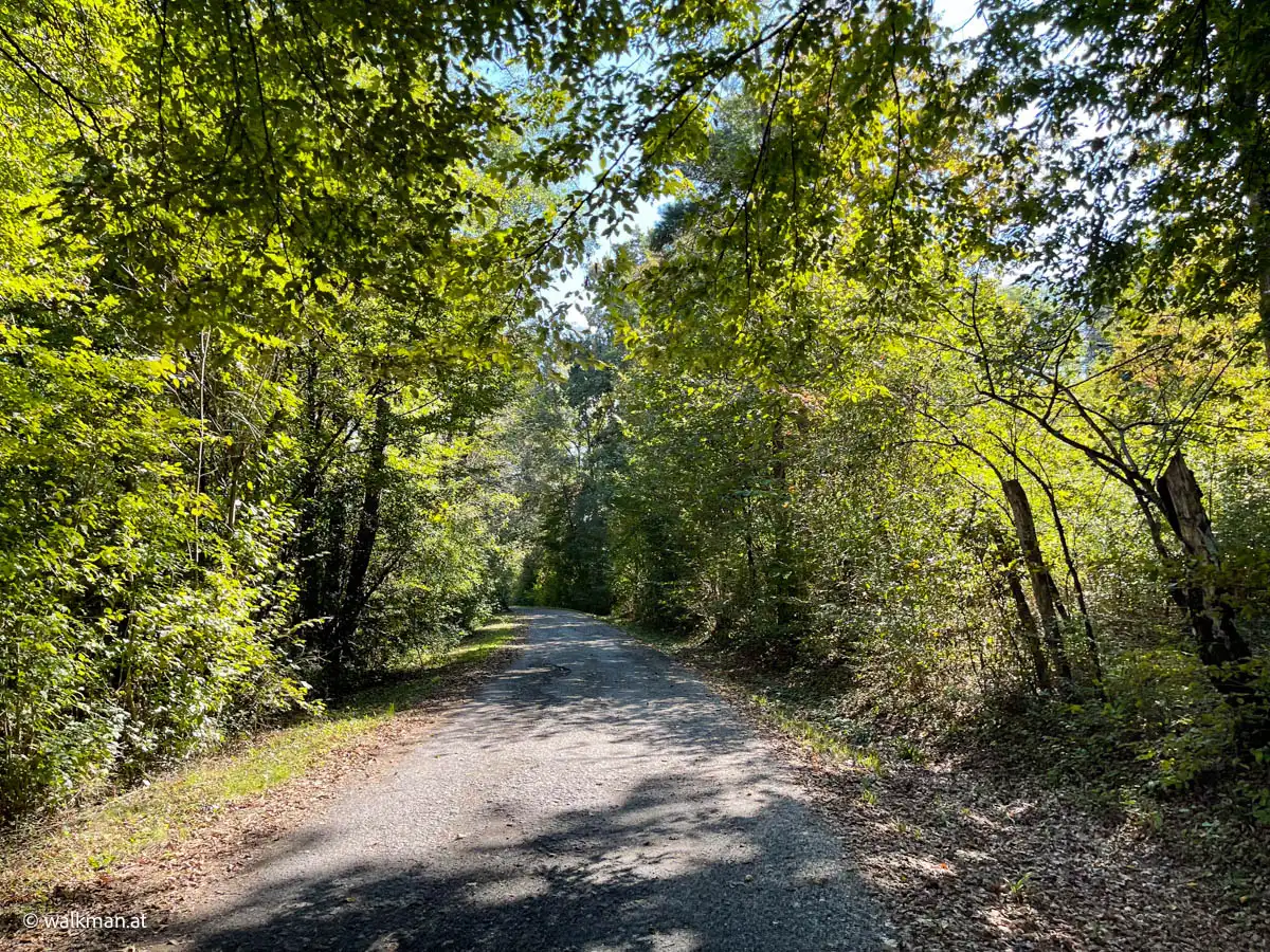 Auch dieser Abschnitt beschert keine Probleme. Flach bis leicht abfallend. In einer schattigen, links und rechts vom Bäumen und Gebüsch, gesäumten Allee geht’s hier dahin. Ab und zu lichtet sich rechts das Gebüsch und gibt den Blick auf die Burg Güssing frei. Ein schönes Fotomotiv.