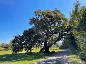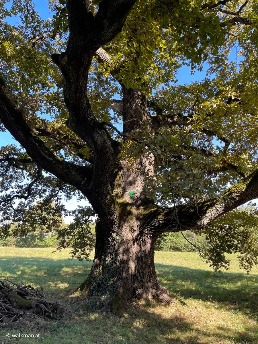 Das alles tut der imposanten Erscheinung aber keinen Abbruch. Es unterstreicht nur einmal mehr das alter der Eiche und regt an zum Innehalten und Sinnieren. Was mag dieser Baum alles gesehen haben im Laufe seines Lebens. Welche Menschen und Tiere haben in seinem Schatten Schutz vor der Sonne gesucht. Welche Unwetter hat die Eiche bereits überstanden. Ja, wenn dieser Baum erzählen könnte. Die Geschichten würden vermutlich mehr als ein Buch füllen.