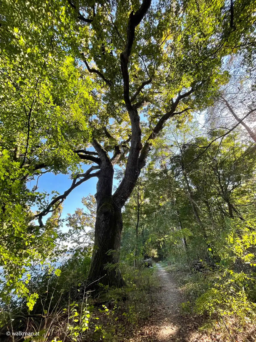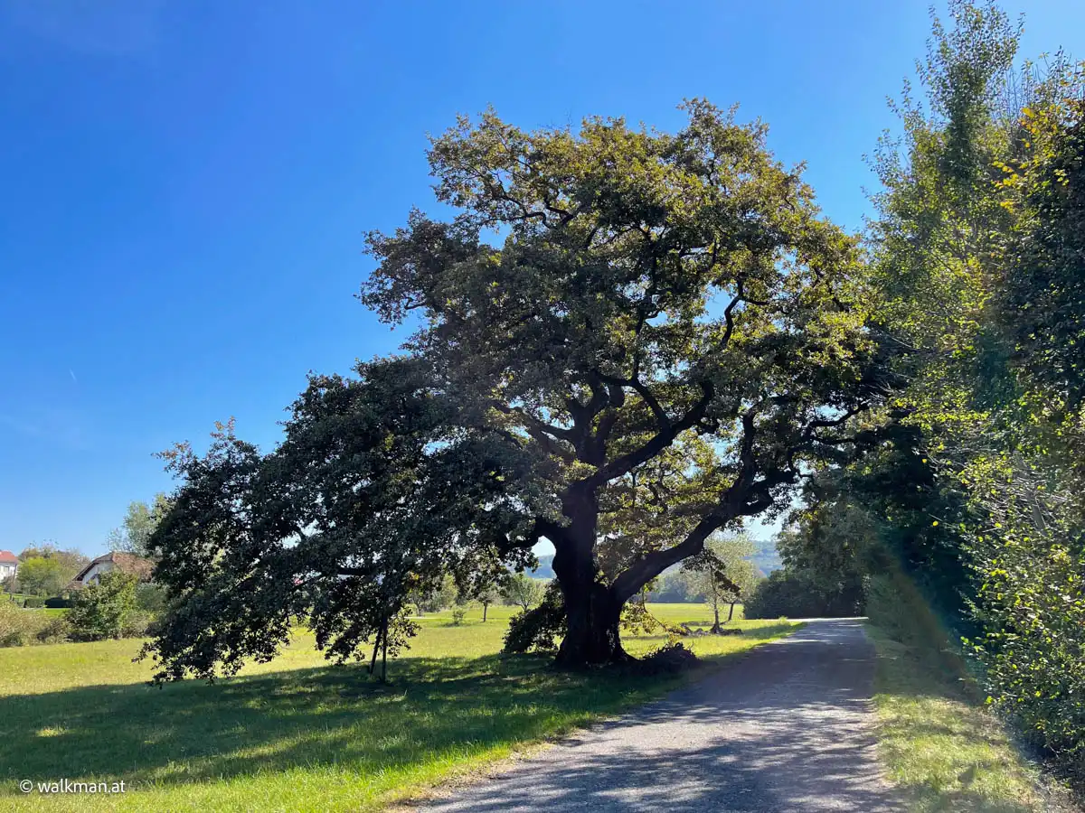 Vom Parkplatz weg, nach Süden wandere ich zunächst aus dem Stausee-Areal hinaus. Um gleich bei meinem ersten Highlight vorbeizukommen. Die denkmalgeschützte Eiche, bei der Stausee-Einfahrt. Ein mächtiger, riesiger Baum, der hier schon viele Jahre steht. Teils mit gestützten Ästen. Manche bereits abgebrochen. Und die Krone ein wenig einseitig, ob der strassenseitig gestutzten Krone.