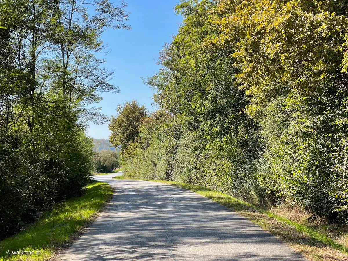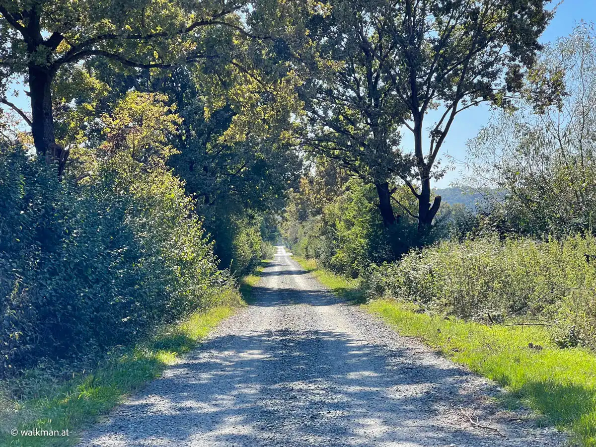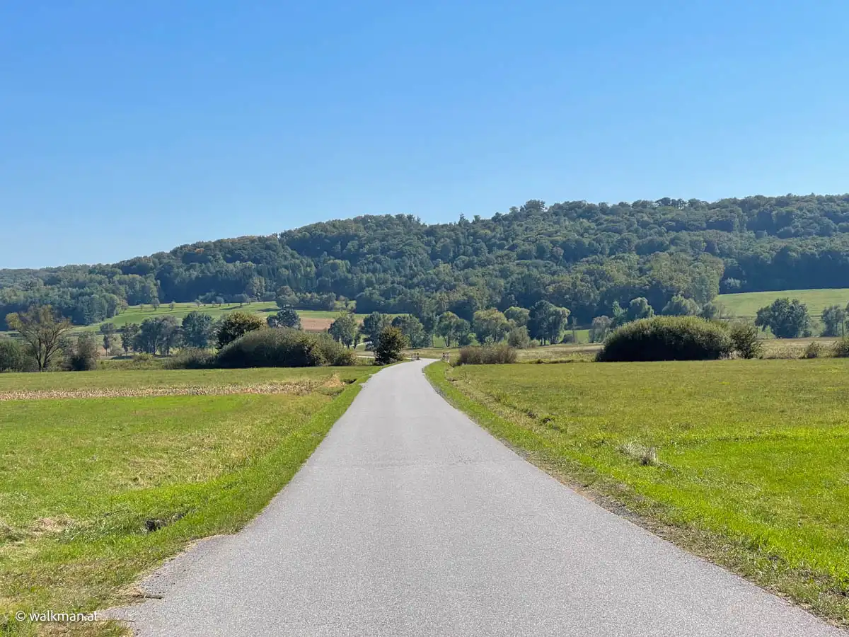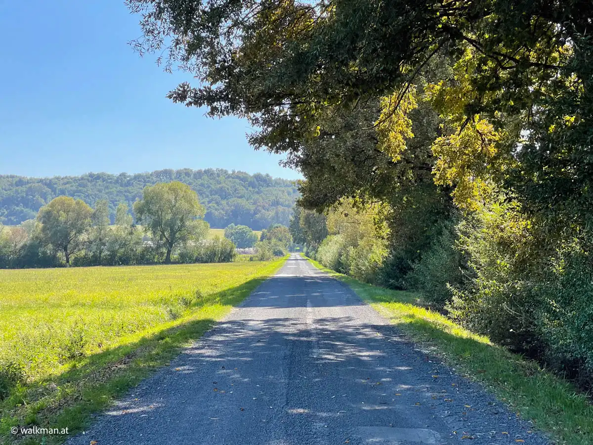 Weiterhin auf asphaltiertem Untergrund spazierend genieße ich das Wetter heute so richtig. Bei strahlendem Sonnenschein, mit ab und zu schattigen Abschnitten der Bäume am Straßenrand, wandere ich leise vor mich hinsummend durch die flache Landschaft des Stremtals.