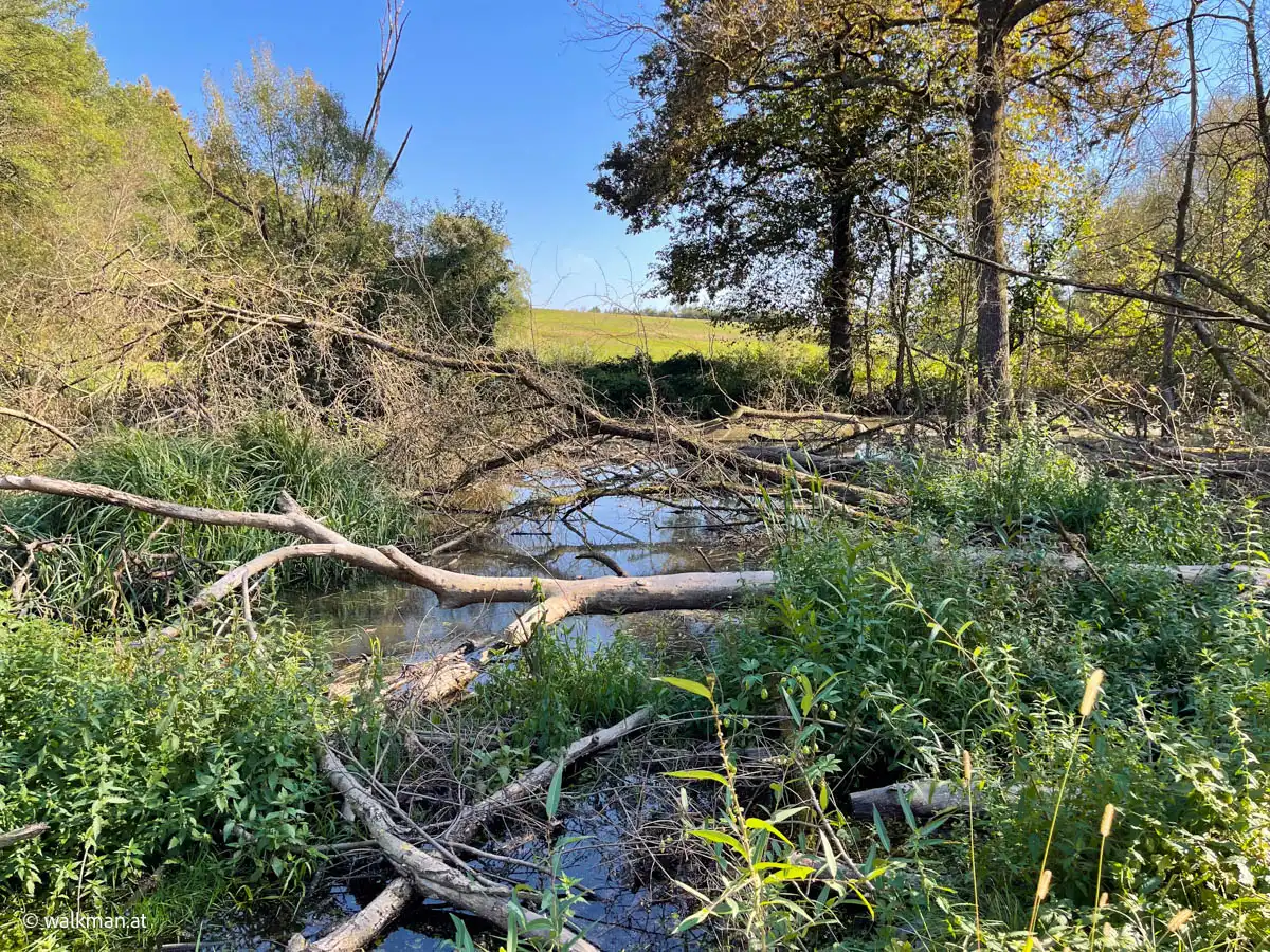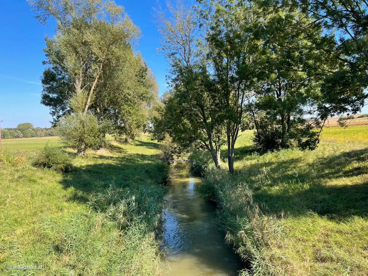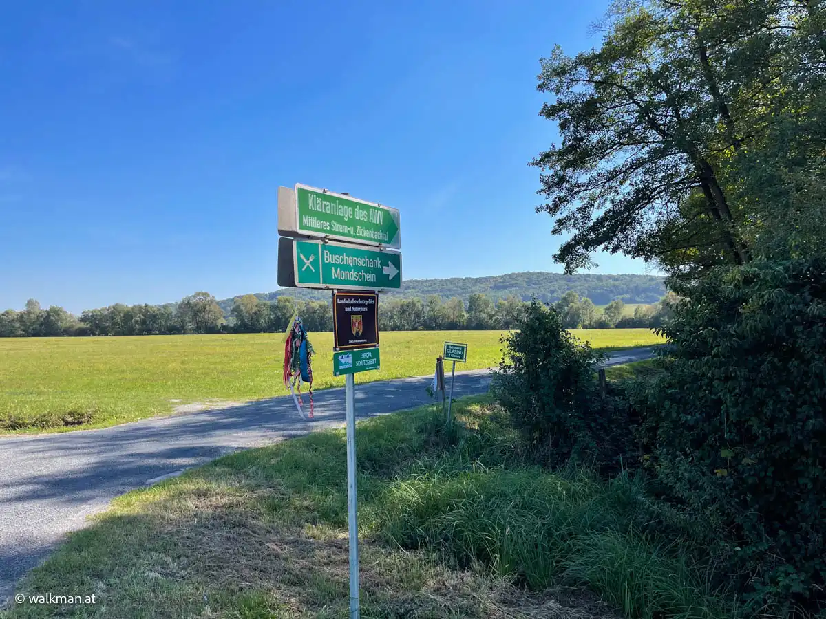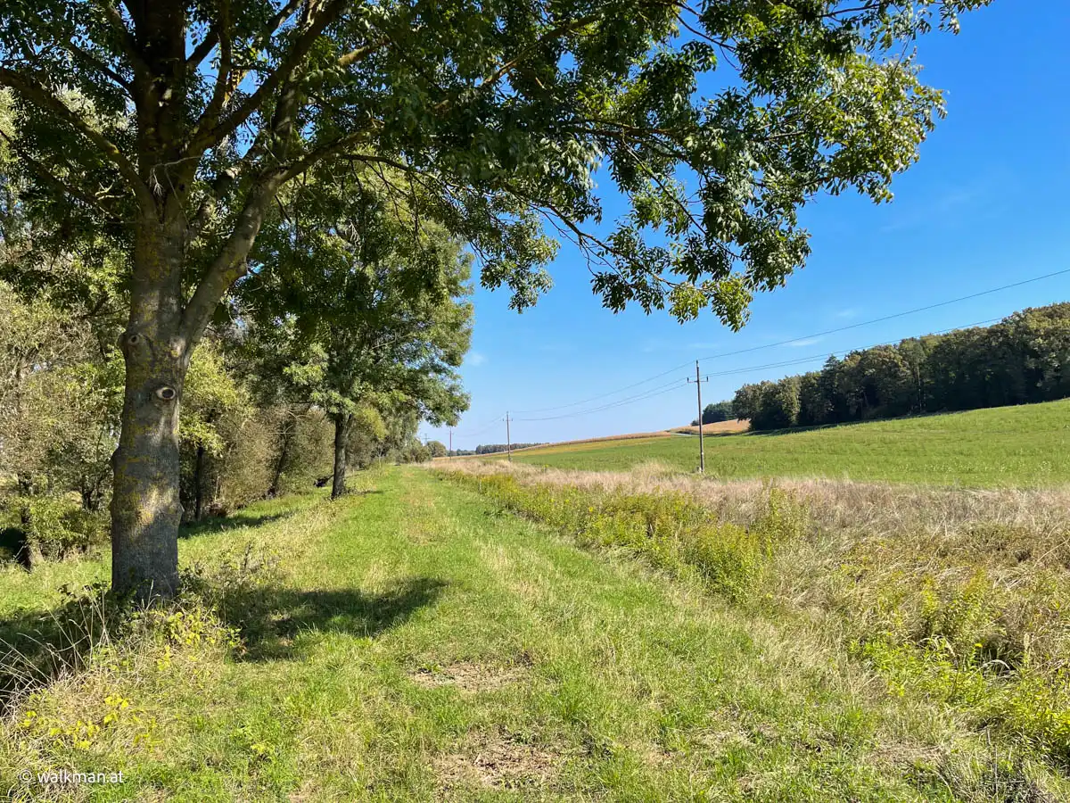 Weiterhin auf asphaltiertem Untergrund spazierend genieße ich das Wetter heute so richtig. Bei strahlendem Sonnenschein, mit ab und zu schattigen Abschnitten der Bäume am Straßenrand, wandere ich leise vor mich hinsummend durch die flache Landschaft des Stremtals.