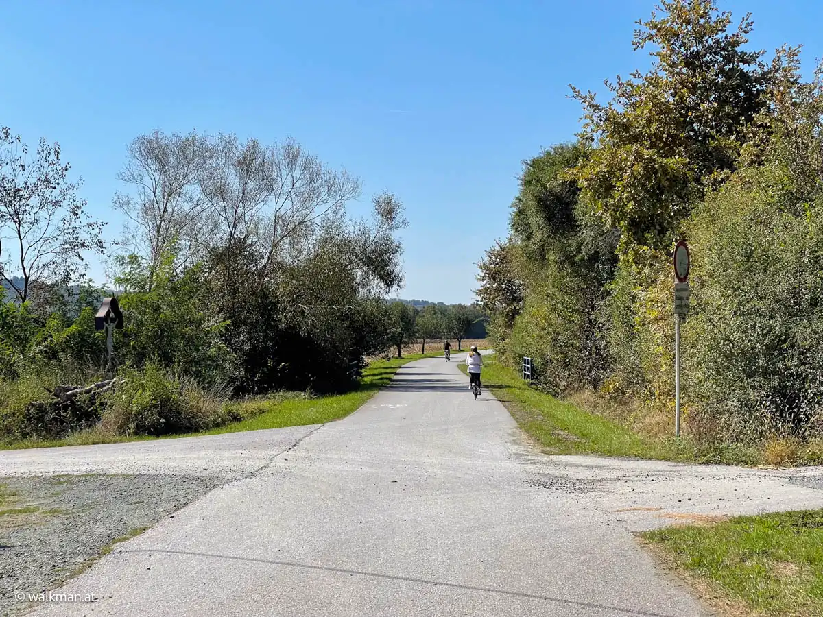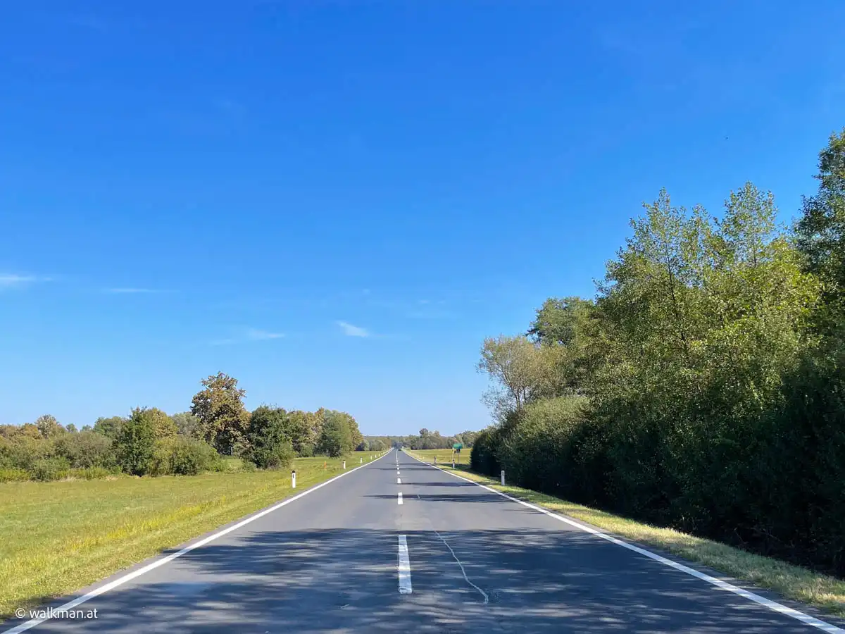 Also bleibe ich brav links, schwenke bei Gegenverkehr noch ein wenig mehr ins Gras am Bankett hinein, um etwas mehr Abstand zwischen mich und die vorbei flitzenden Fahrzeuge zu bringen. Nach ca. 20 Minuten, oder bei Streckenkilometer 1,5 führt dann meine Route, in Form eines weiteren Güterwegs, von der Bundesstraße weg, in Richtung Strem.