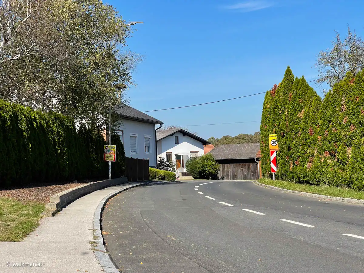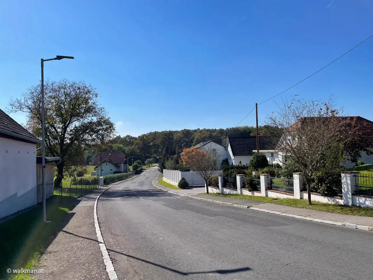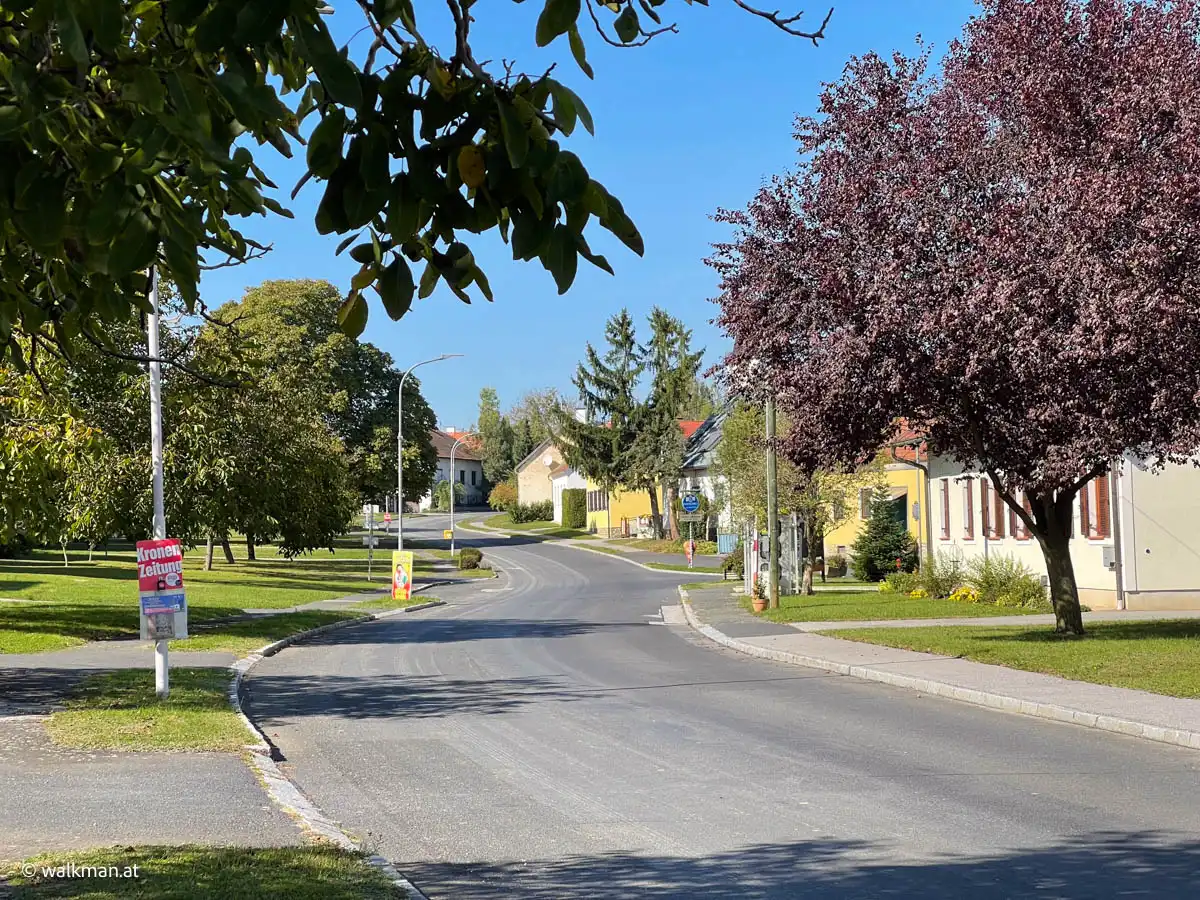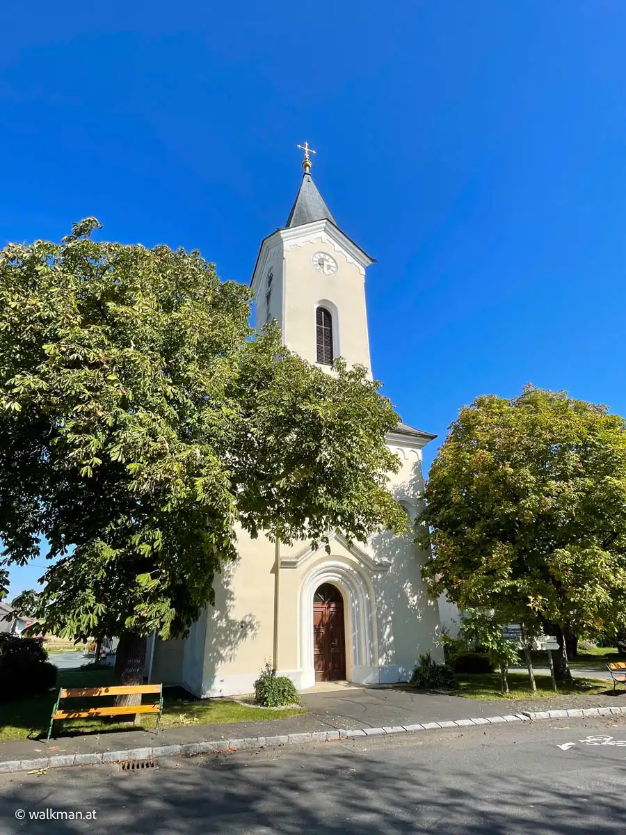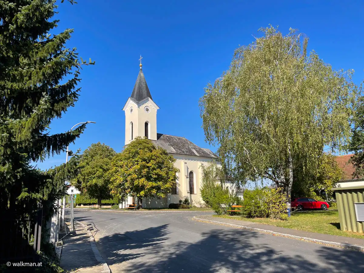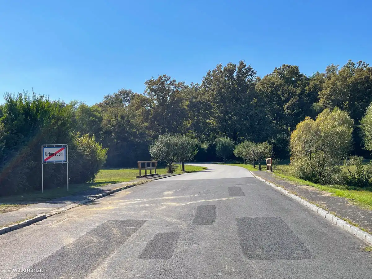 Nun marschiere ich am Gehsteig des Ortes weiter. Hinein nach Urbersdorf und über einen leichten Anstieg, ins Zentrum, zur Kirche hinauf. Vorbei an gepflegten Vorgärten. Unter Nussbäumen hindurch, die bereits erste reife Früchte zu Boden fallen lassen.