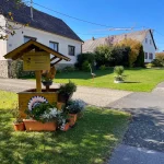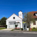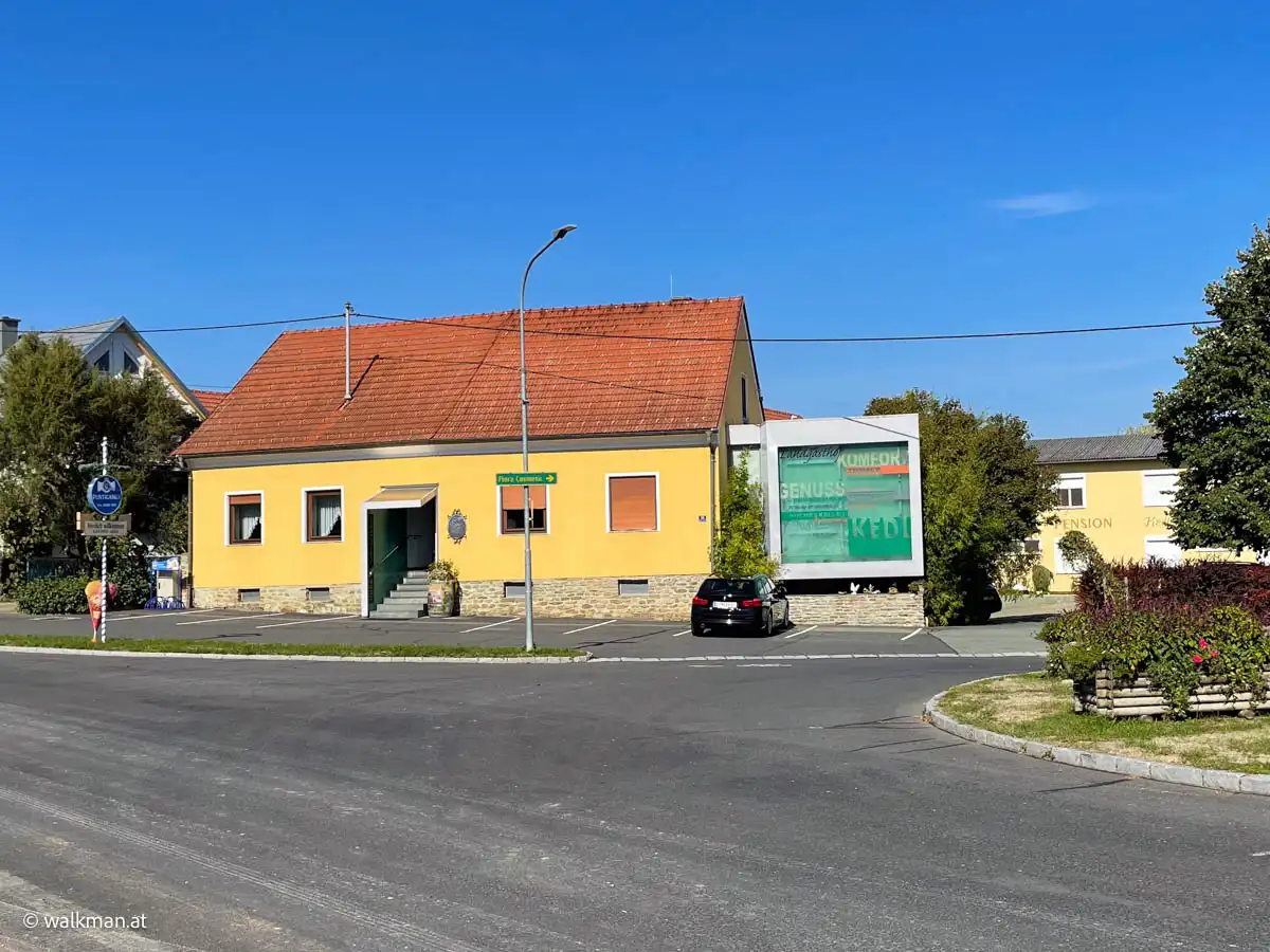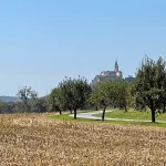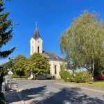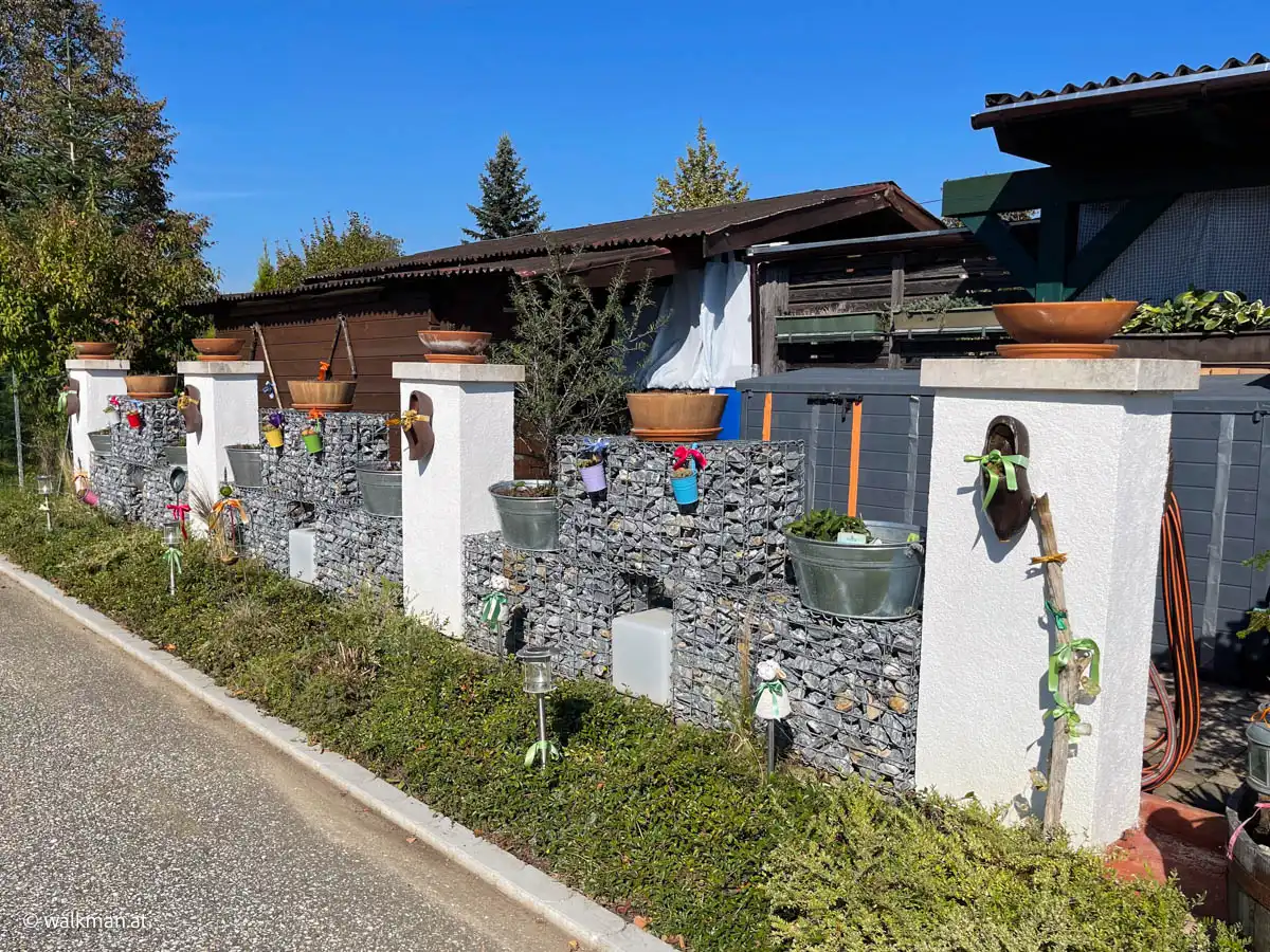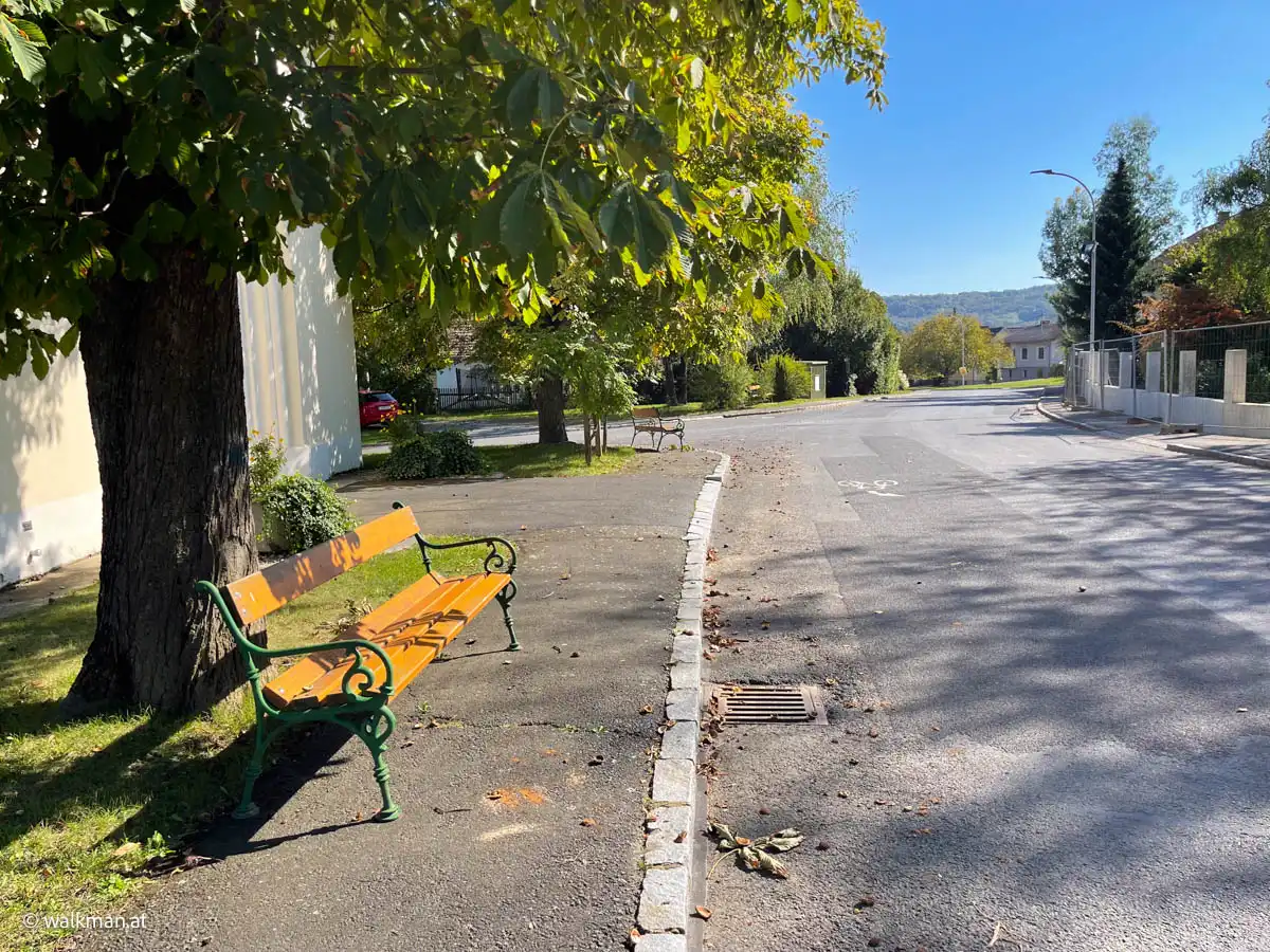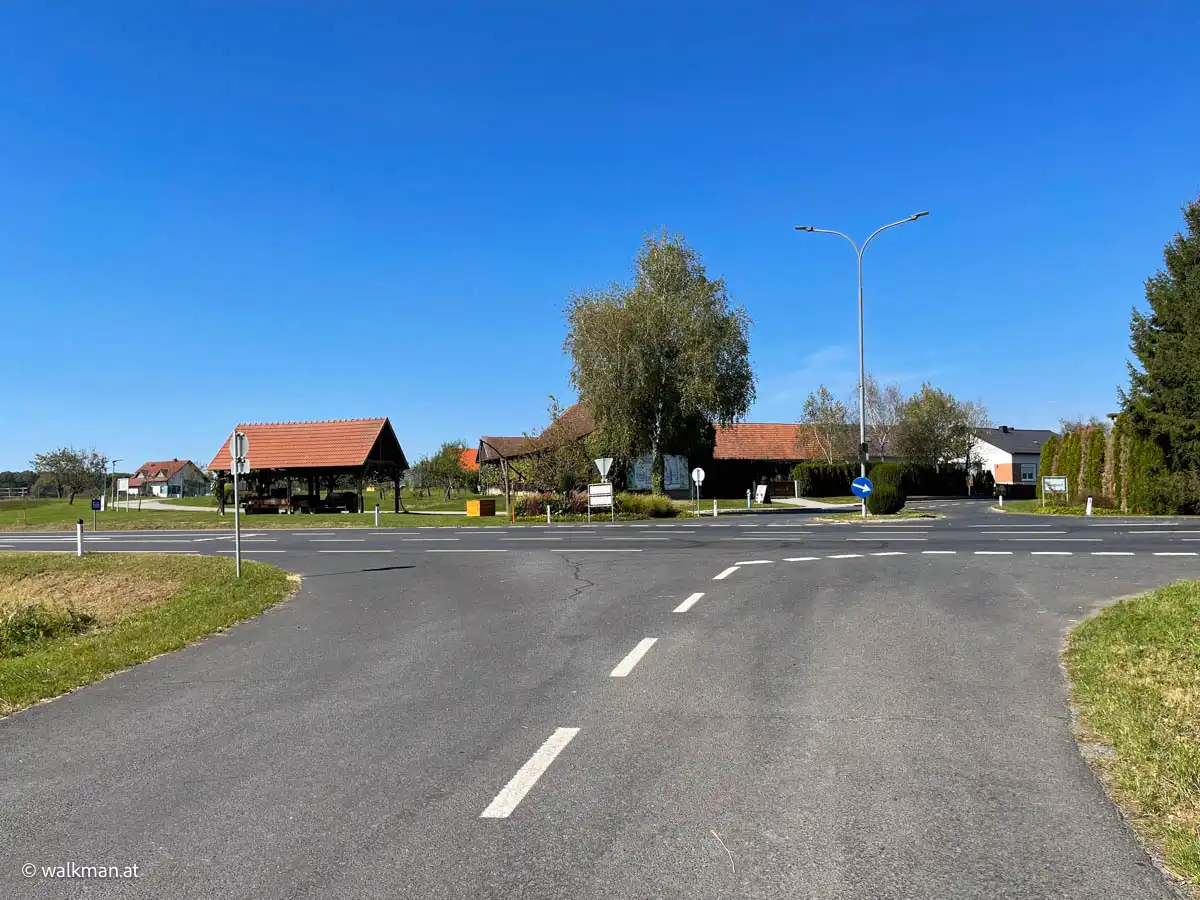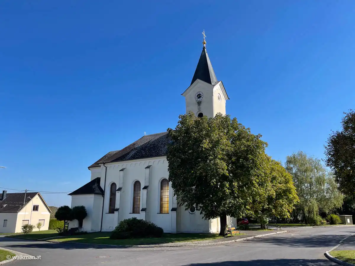Nun marschiere ich am Gehsteig des Ortes weiter. Hinein nach Urbersdorf und über einen leichten Anstieg, ins Zentrum, zur Kirche hinauf. Vorbei an gepflegten Vorgärten. Unter Nussbäumen hindurch, die bereits erste reife Früchte zu Boden fallen lassen.