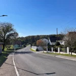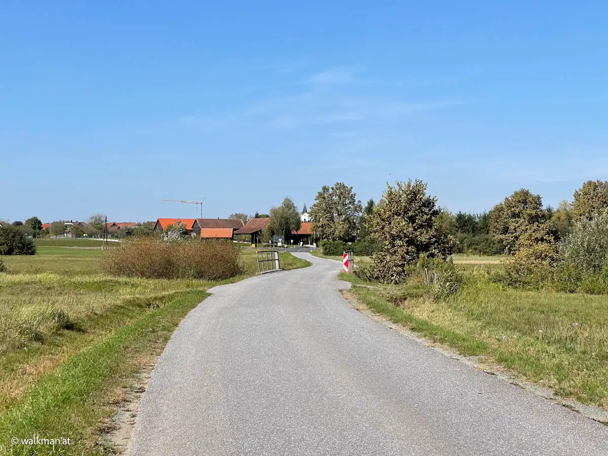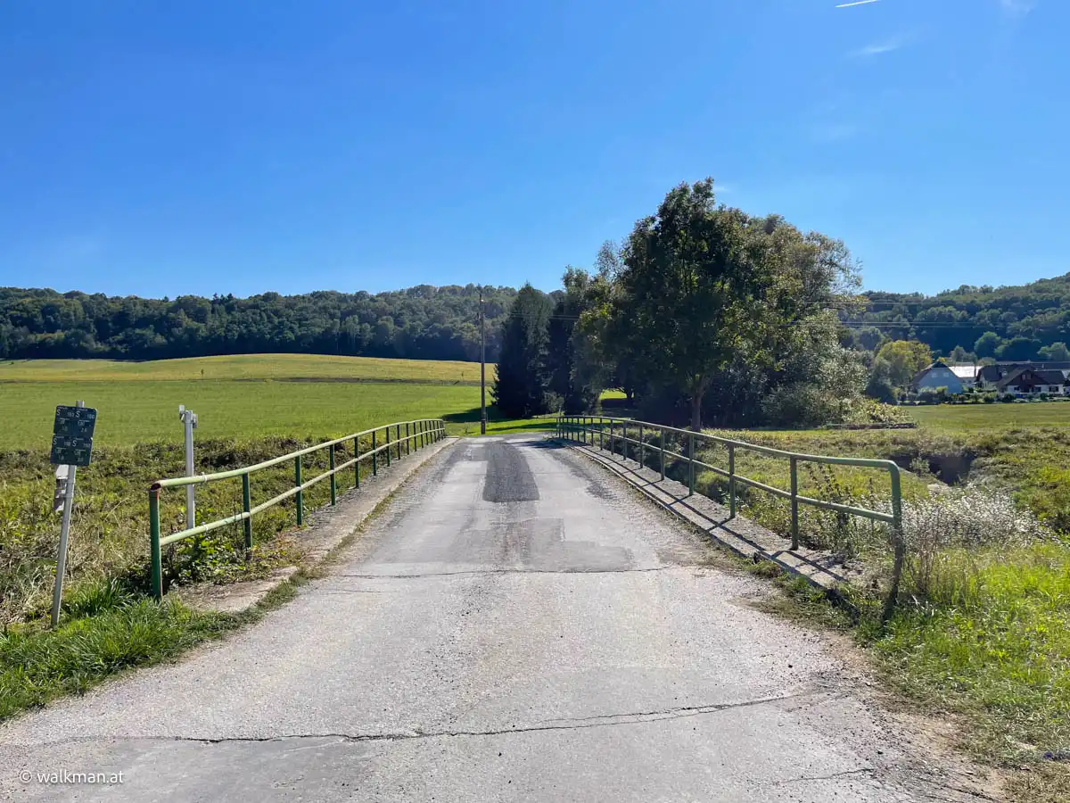 Nach insgesamt knapp einer Stunde Wegzeit, habe ich dann die zweite Brücke erreicht. Hier, am Ende des Wiesenwegs, halte ich mich links, marschiere über die Brücke drüber und bin nun wieder Richtung Urbersdorf unterwegs. Auf einem schön asphaltierten Güterweg. In der Ferne kann ich auch bereits den Kirchturm von Urbersdorf sehen. Was natürlich im Handy verewigt werden muss: Knips, knips, knips.