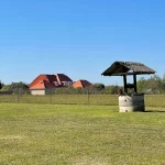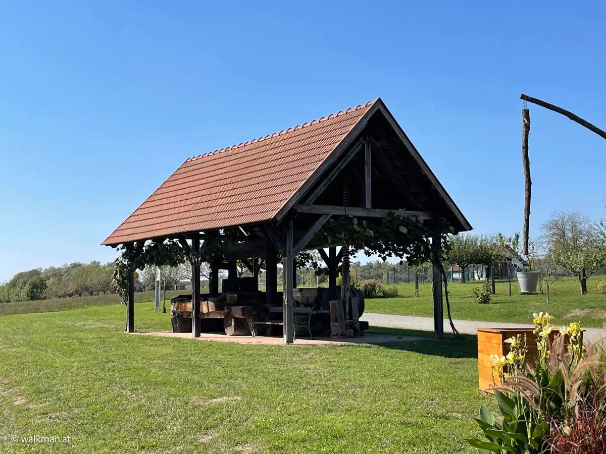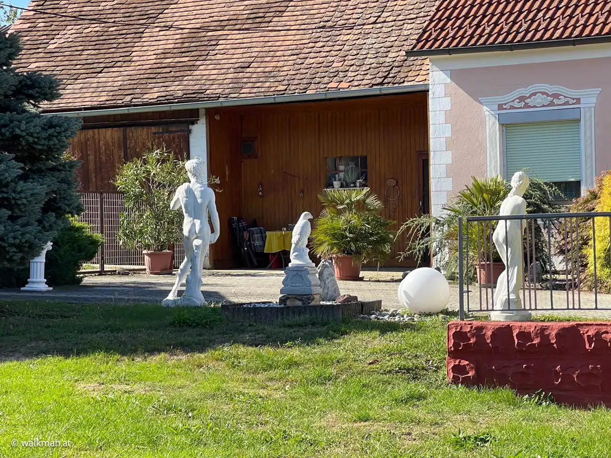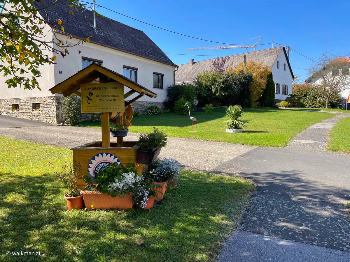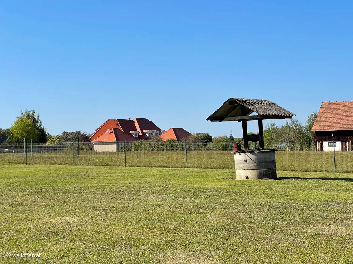 Bei Kilometer 4,3 überquere ich wieder die Bundesstraße. Hier, an der Ortseinfahrt nach Urbersdorf, findet man links auch eine Rastmöglichkeit. Bei der ausgestellten alten Presse. Samt nachgebauten, pannonischem Brunnen daneben. Das ist was für’s Auge und für das Handy. Abermals: Knips, knips, knips.