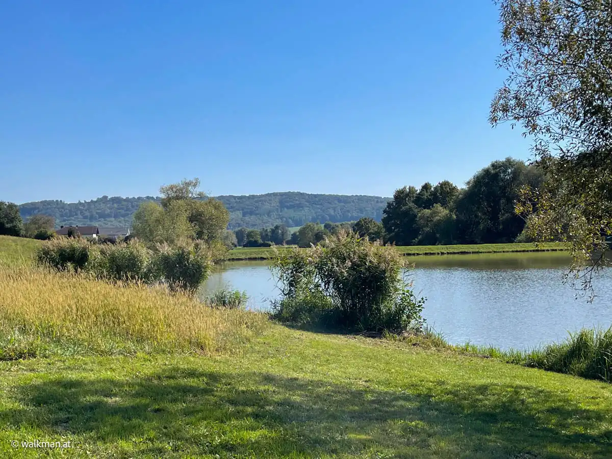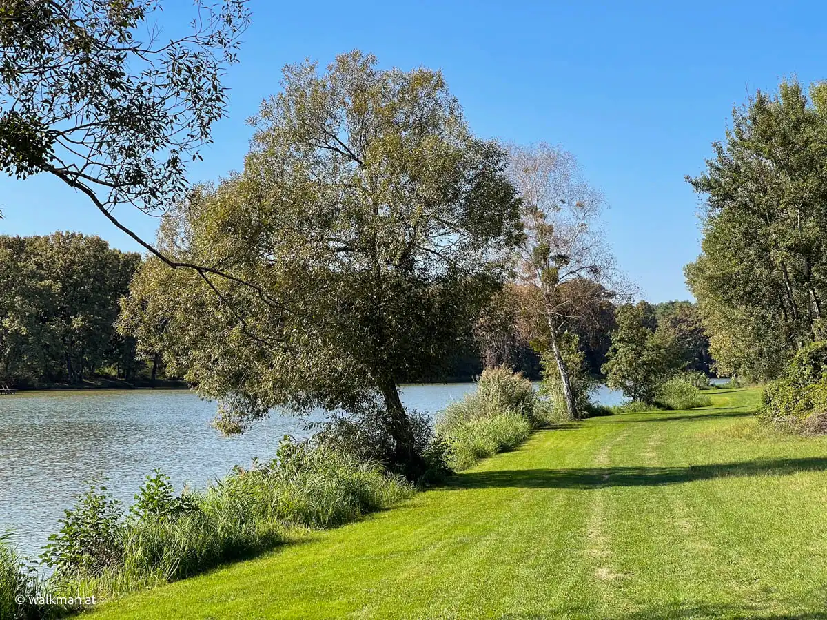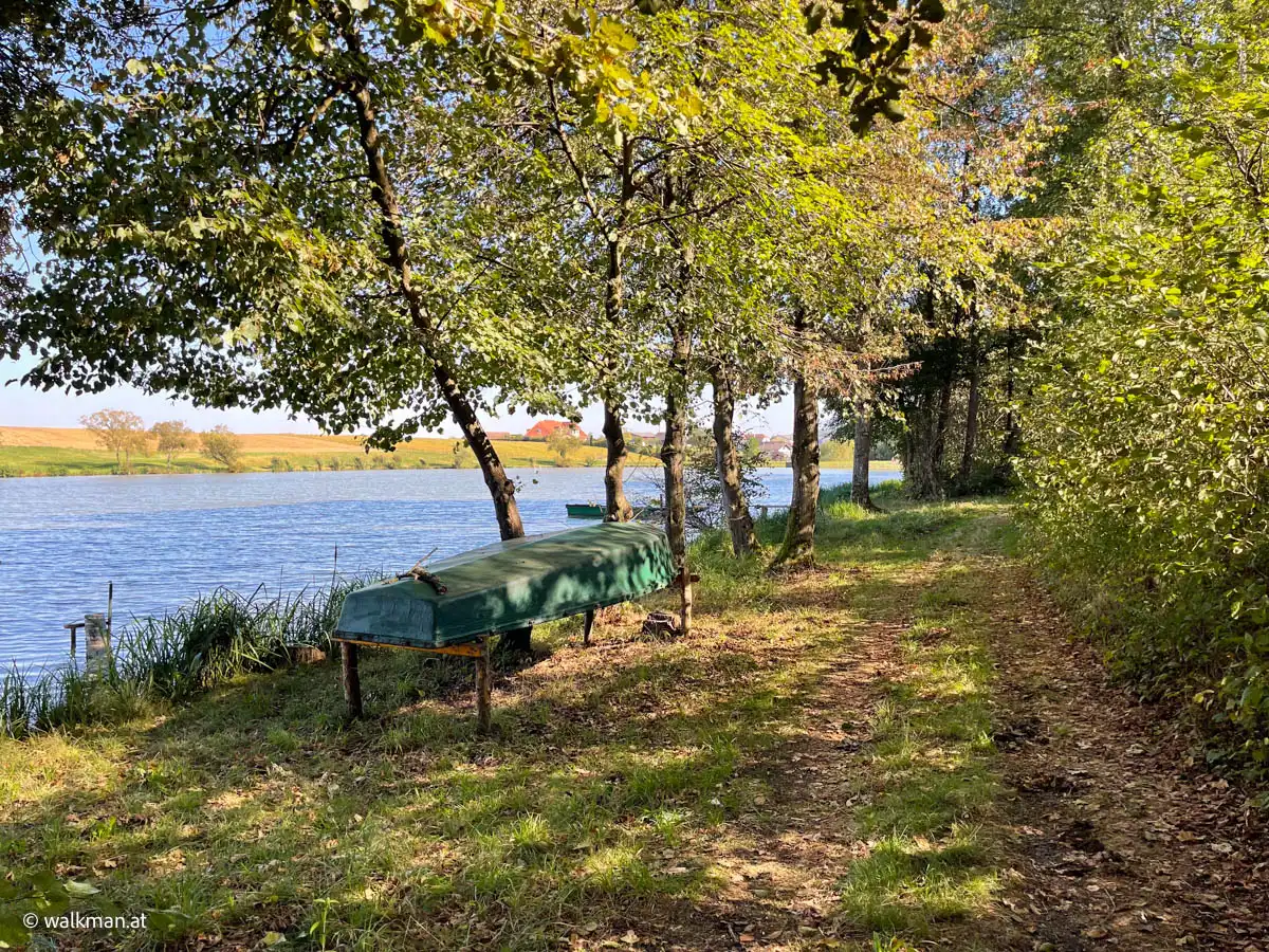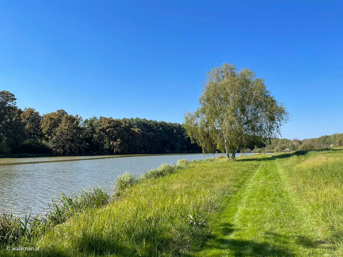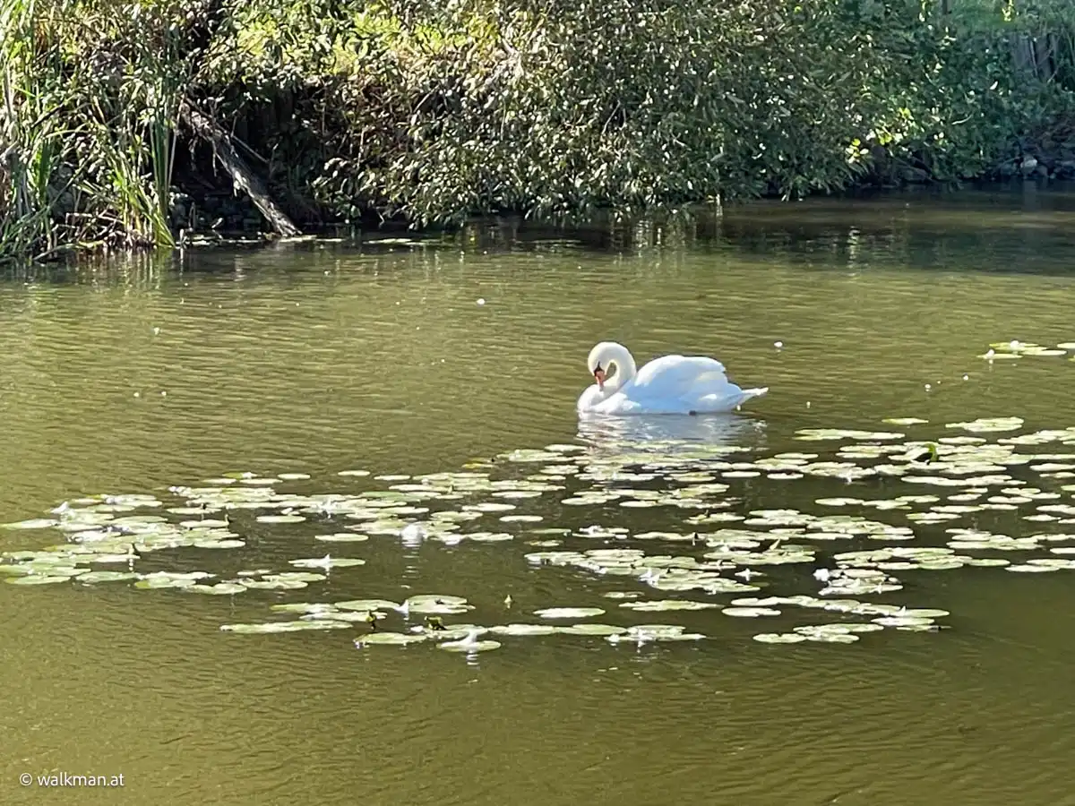 Allerdings nicht bis ganz nach hinten, zum Weg, auf dem ich aus dem Areal heraus gewandert bin. Nein, ich biege bereits vor der Brücke rechts die Gasse hinein. Auch diese führt zum See nach hinten und macht in weiterer Folge meine Rundwanderung perfekt. Ohne einen Abschnitt zweimal zu gehen.