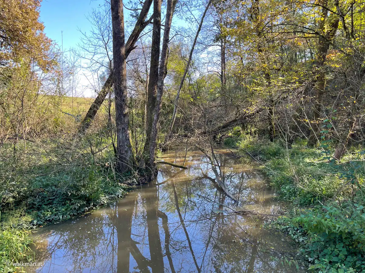 Der folgende, ca. 1,1 Kilometer lange Abschnitt, ist jetzt zwar keine Bilderbuchausgabe einer Au-Landschaft. Aber schmuck und relativ angenehm zu gehen ist er dennoch. Links die Strem, die sich ihren (hier regulierten) Weg durch die Gegend bahnt, und rechts, der Güssinger Ortsteil Glasing, mit den geschwungenen Hügeln hinauf zu den Ausläufern der Alpen.