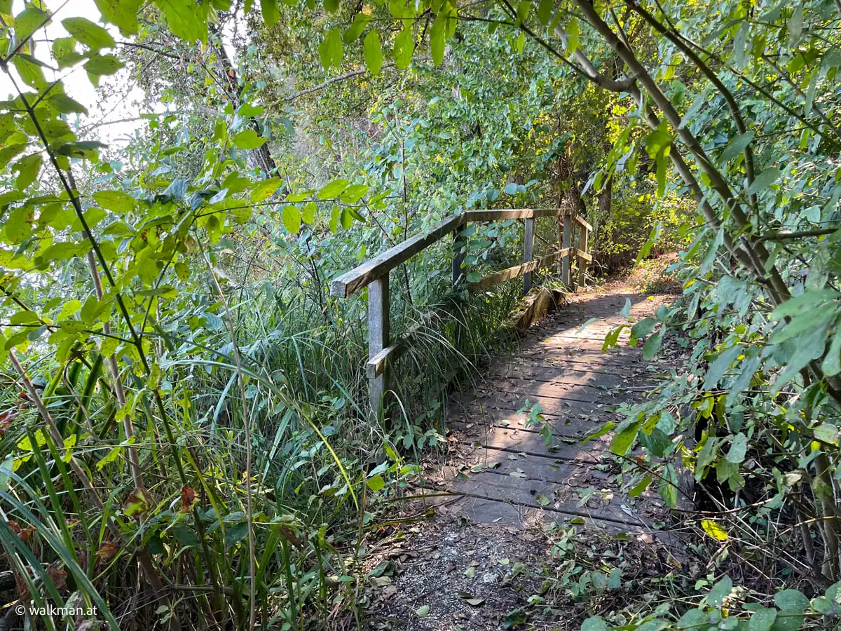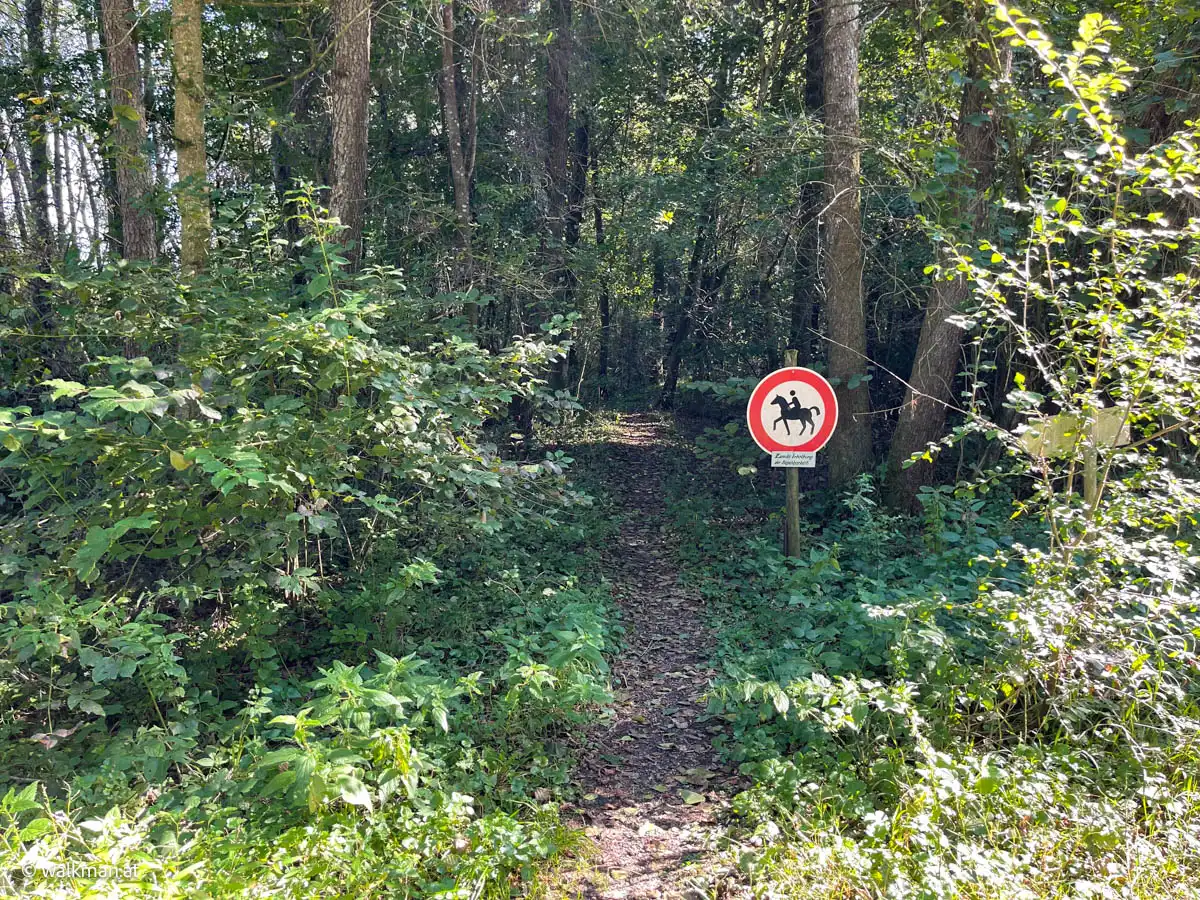 Nun aber, scheint die Pflegschaft des Sees eingelenkt zu haben. Der neue Weg führt hier, ein wenig höher gelegen, ein kurzes Stück durch den Wald. Macht Sinn und ist auch gut so. Darunter erkennt man, dass der Sumpf sich wieder vollends ausgebreitet hat. Von der ehemaligen Wegführung ist nichts mehr zu sehen.