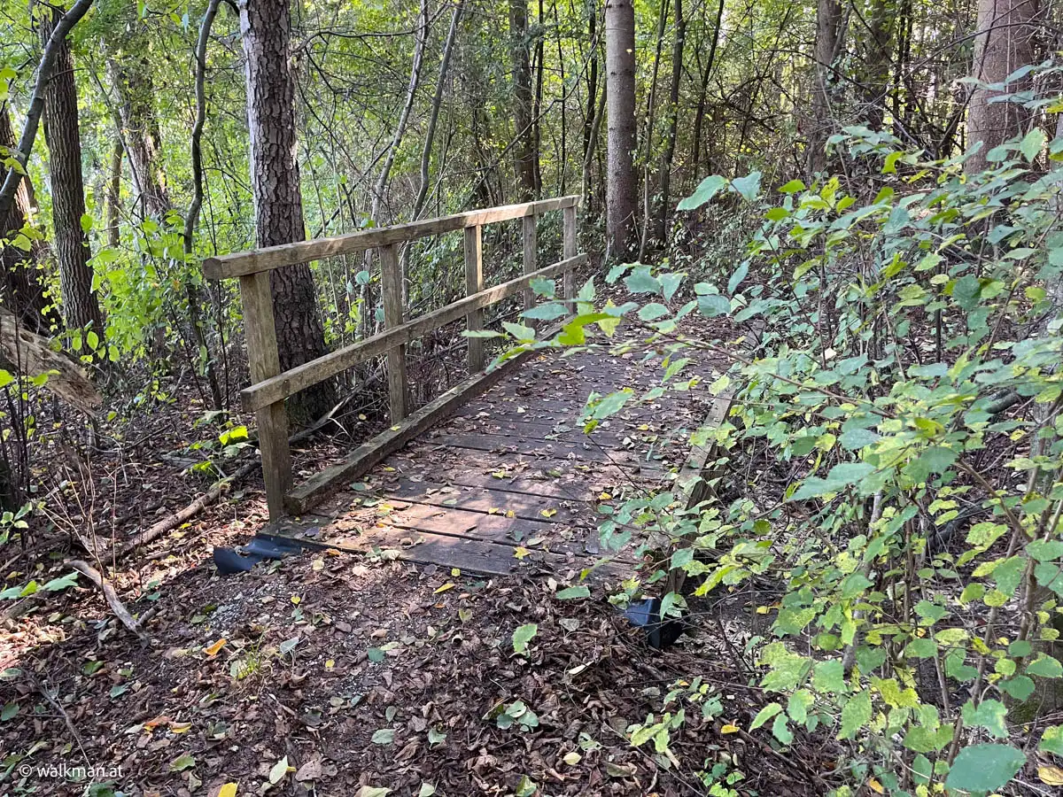 Angekommen an Schotterweg, der am Nordufer des Sees vorbei führt, halte ich mich links und spaziere diesen ein Stück weit entlang. Links und rechts gesäumt vom Sumpfgebiet hat dieser verdichtete, geschotterte Waldweg aber offensichtlich Bestand. Und auf der Holzbrücke, die ich ebenso überquere, ist auch mit Spraydose die Jahreszahl „2024“ verewigt. Vermutlich eine Bestätigung zur heurigen Wartung und Servicierung. Und ja, natürlich stampfe ich etwas härter über die Bohlen, um ihre Festigkeit selbst nochmals zu „überprüfen“. Sie sind fest. Bestätigt.