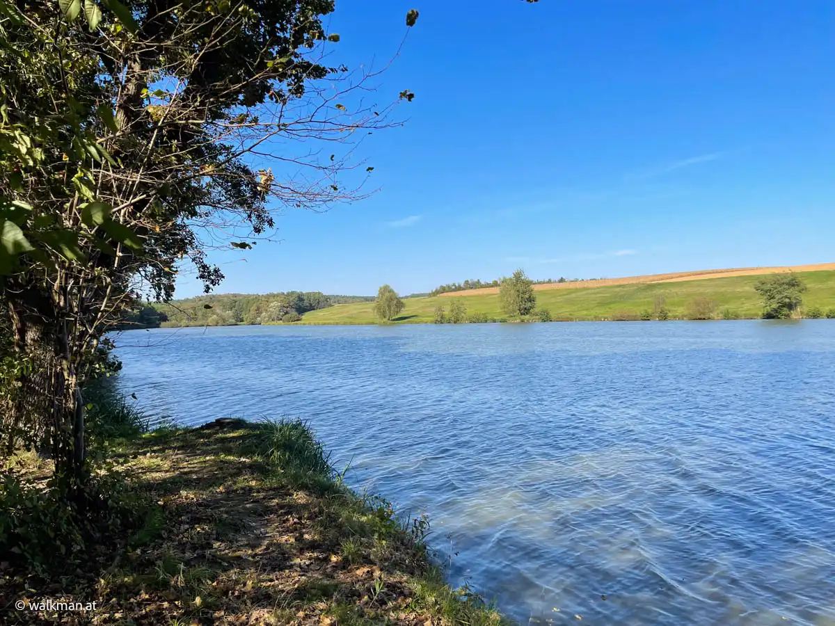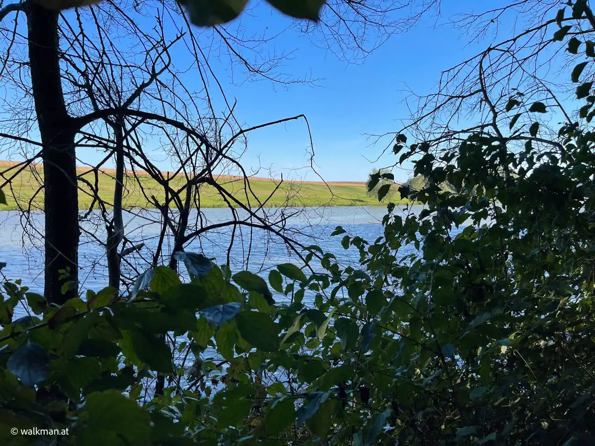 Angekommen am Damm des Stausees habe ich nun die Wahl: Am Damm entlang zum Parkplatz und Auto hinüber, oder noch eine Runde um den See dazu hängen. Ich entscheide mich für Letzteres. Der Tag ist zu schön, um auf eine See-Runde zu verzichten. Außerdem sind das wieder mehr Schritte fürs Kardiotraining. Das herzliche „Pumperl“ will ja gefordert werden.