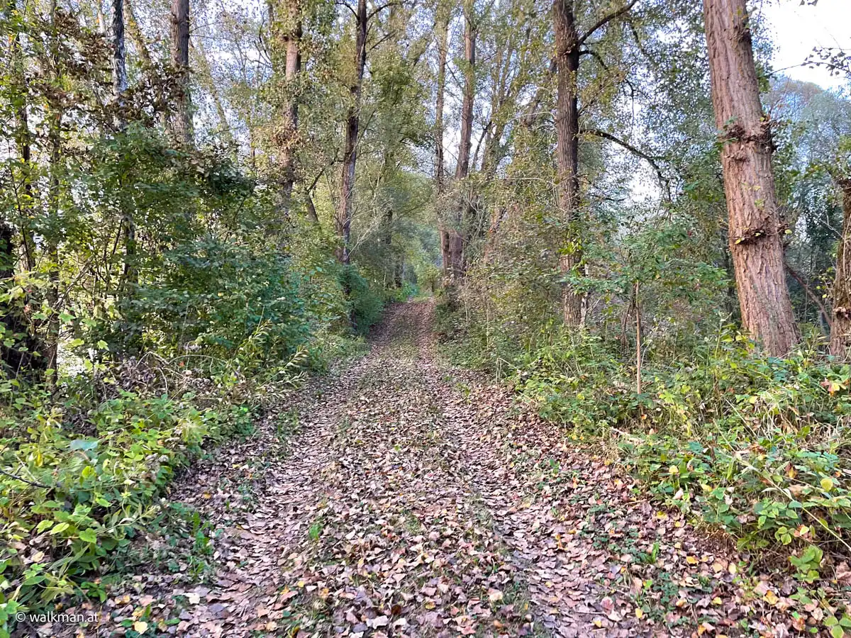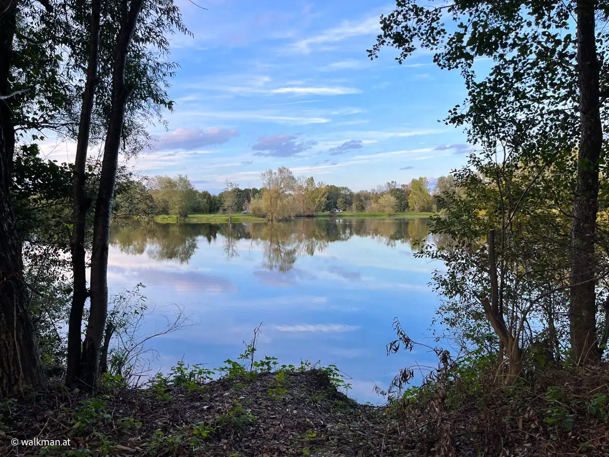 Nach etwa 300 Metern vergrößert sich der Pfad zu einem breiten Feldweg. Auf den folgenden 100 Metern spaziert man in einer Art Allee zwischen dem Fischteich (links) und der Lafnitz (rechts) entlang.