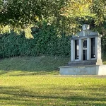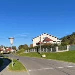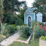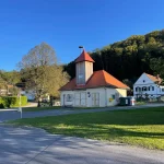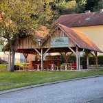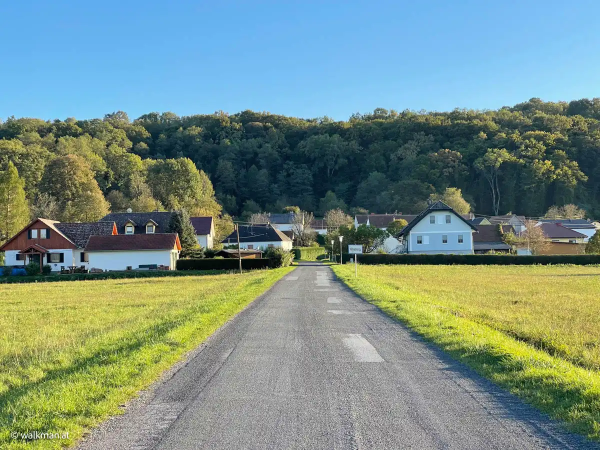 An der Kreuzung hier steht auch der „Weinstadl“. Eine 2021 errichtete, moderne Laube zum Rasten. Soll ich? Nein. Bin doch vorhin erst gestartet. Aber ein andermal gerne. Auf der Hauptstraße halte ich mich nun rechts und marschiere, dem Verlauf der Straße folgend, beim Friedhof und Kriegerdenkmal vorbei, aus dem Ort hinaus.