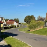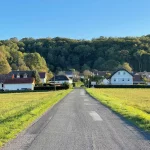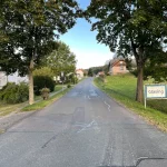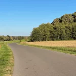 Auf der anderen Seite, jetzt wieder auf Asphalt, nach rechts und kurze Zeit später, dem Asphaltband folgend, nach links. In der Ferne sehe ich wieder einen Hund. Diesmal aber extra groß. Am anderen Ende der Leine ein Pärchen. Hier scheinen einige auf den Hund gekommen zu sein. Schön.