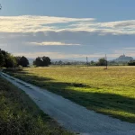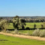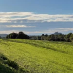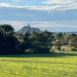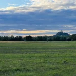 Im Norden kann ich die Häuser von Urbersdorf mit dem markanten Kirchturm dazwischen erkennen. Beim Blick zurück präsentiert sich die Burg Güssing in ihrer vollen Pracht und hebt sich, auf ihrem markanten Vulkanhügel, prominent aus der Ebene hervor. Das gesamte Bild wird von vielen sattgrünen Wiesen mit dahinter liegenden Wäldern ergänzt. Nahezu perfekt.