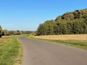 Bis etwa Streckenkilometer 1,8 folgt nun eine weitgehend unspektakuläre Wanderung über die Landstraße, die Glasing mit Sumetendorf verbindet. Über die typisch südburgenländische Landschaft, weitgehend flach mit sanften Hügeln.