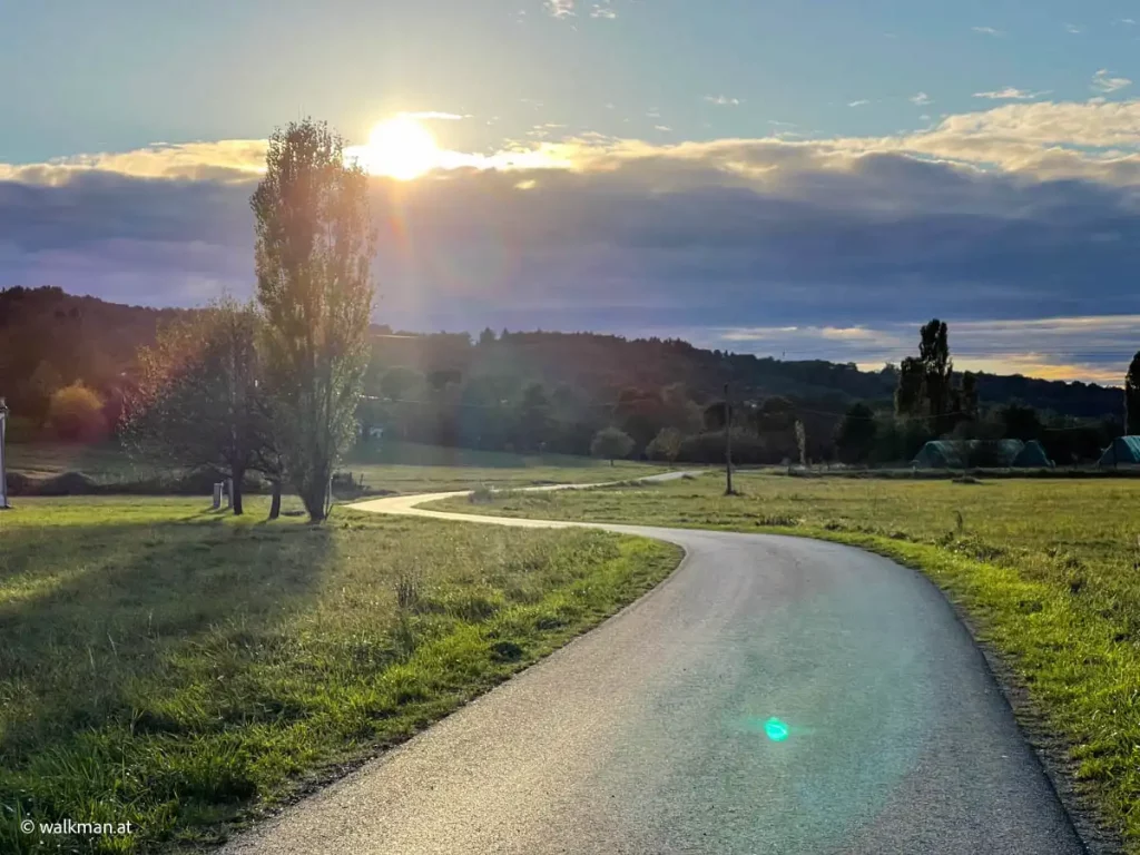 Die Möglichkeit eines neuerlichen, tierischen Kontakts meinerseits, ist diesmal aber gering. Mein Weg führt mich, bei der nächsten Gasse wieder nach rechts hinein. Weg vom Konfrontationskurs. Auf dem schwarzen, geschwungenen Asphaltband weiter durch die schöne Landschaft.
