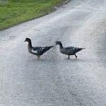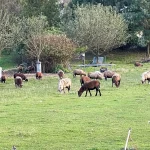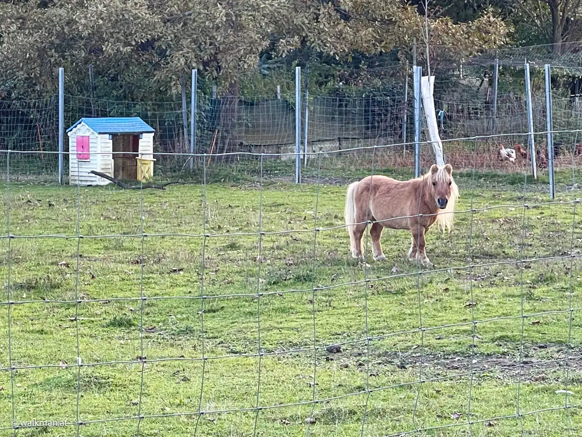 Ein wenig später spaziere ich bei einem Gehöft vorbei, das fast schon einem Tiergarten gleicht. Ponys, Schafe, Enten, Gänse, Hühner in grosser Anzahl und weitläufigen, artgerechten Gehegen. Die fühlen sich hier sichtlich wohl. Und da sind, um auf die Größe des Anwesen rückzuschliessen, sicher noch mehr Tierarten, die ich nicht zu Gesicht bekommen habe.