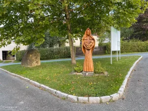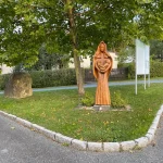 Vom Startpunkt beim Wirt führt meine heutige Tour gleich mal ein wenig bergauf, gegenüber vom Gasthaus die Gasse hinein. Keine 100 Meter später wandere ich auch schon beim ersten „Highlight“, einer schönen, hölzernen Marienstatue, vorbei. Diese scheint noch nicht lange hier zu stehen und wirkt, als wäre sie gestern kunstvoll aus einem mächtigen Stamm geschnitzt worden. Gefällt mir.