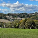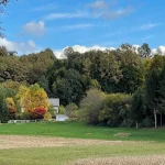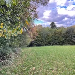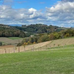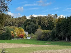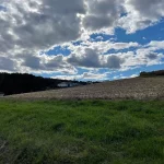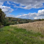 Wieder auf dem richtigen Weg unterwegs, beginnt hier jetzt auch der erste Anstieg der Tour. Eher stampfend, als wandernd lenke ich meine Schritte durch hohes Gras den Hügel hinauf. Die Kulisse ist nach wie vor malerisch. Über dem Land ziehen nach wie vor weiße Wolken durch den azurblauen Himmel. Und die Landschaft selbst wechselt aktuell ihr Kleid vom Sommer zum Herbst. Mitsamt all den tollen bunten Farben, welche die vorletzte Jahreszeit im Jahr mit sich bringt.