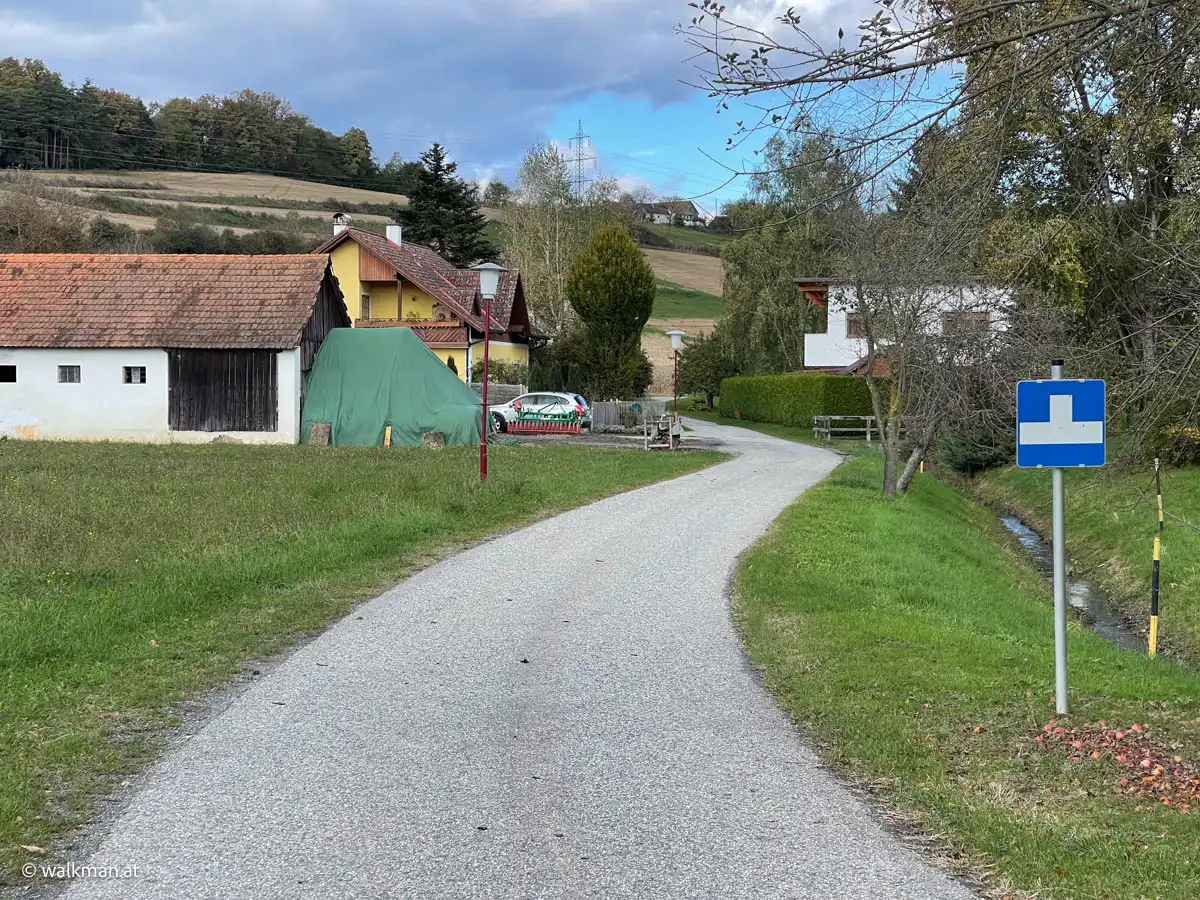Also mit dem Auto umkehren und wieder hinaus aus dem Ort, Richtung Bundesstraße die Kukmirn mit Eltendorf verbindet. Hier, am Anfang der Straße nach Zahling rein, sind zwar auch keine ausgewiesenen Parkplätze, aber immerhin besteht hier die Möglichkeit, den PKW am Straßenrand abzustellen. So recht und schlecht halt. Aber es geht.