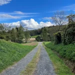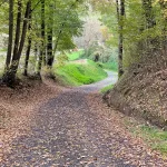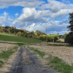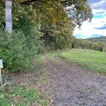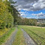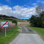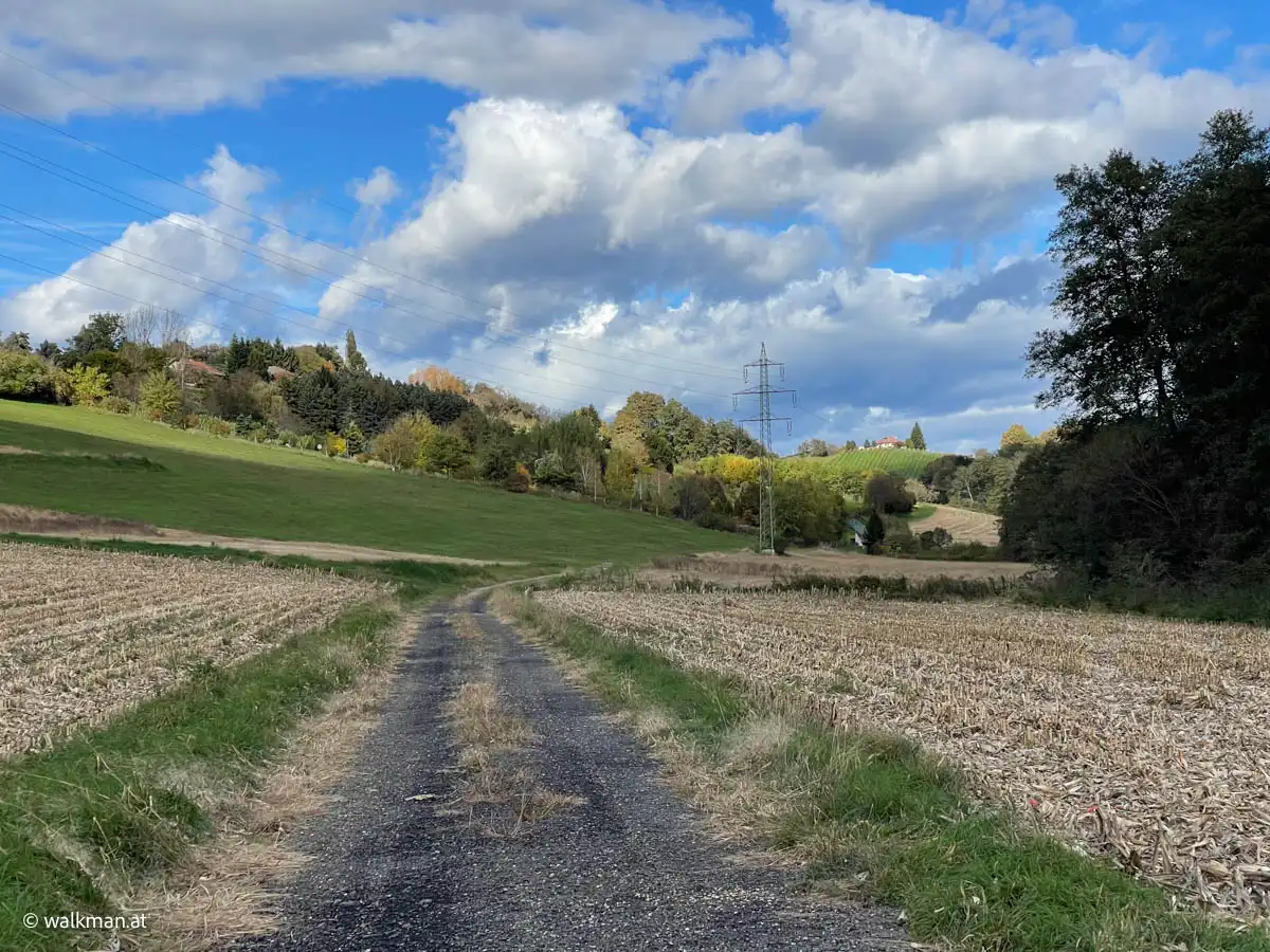 Ich verabschiede mich wieder mal vom Asphalt und marschiere auf einem schönen, geschotterten Feldweg am Waldrand entlang. Weiterhin abfallend und mit wenig Anstrengung verbunden. Dafür aber weiterhin mit guter Laune.
