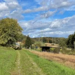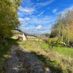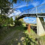 Etwa bei Streckenkilometer 1,4 spaziere ich bei einem Fischteich vorbei. Der Teich selbst ist leider kaum zu sehen und, ob des eingezäunten Privatbesitzes, auch nicht zu umrunden. Aber ein paar Blicke erhasche ich doch. Weit Markanter als der Teich, von denen es ja im Südburgenland unzählige gibt, ist die Brücke, die hier vom daneben liegenden, ebenso eingezäunten, Grundstück über den Feldweg drüber und zum Teich hinunter führt.