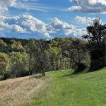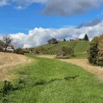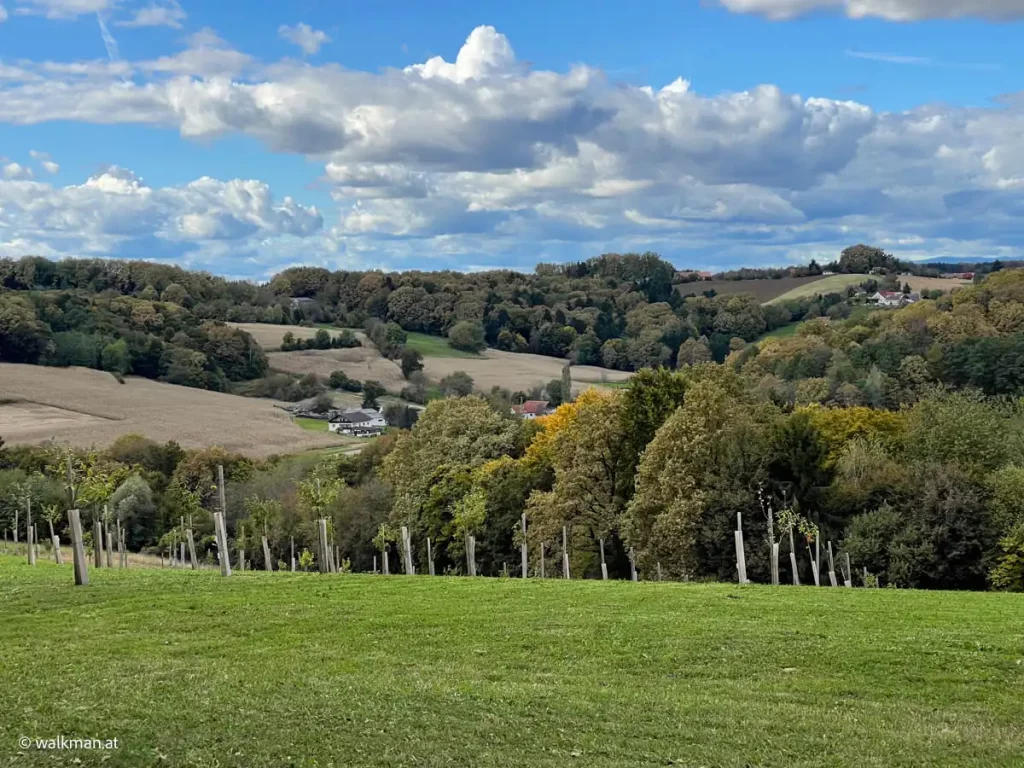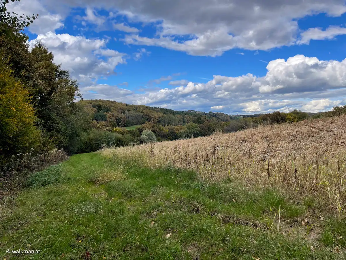 Links, rechts und vor mir lagen die sanften Hügel des Südburgenlandes. Am Himmel zeichnete sich ein fotogener Mix aus tiefblauem Himmel mit weißen Wolken ab. Eine herrliche Kulisse. So macht Wandern richtig, richtig Spaß. Immer wieder bleibe ich auf diesem Abschnitt stehen und mache Fotos, während ich durch das Tal nach hinten marschiere. Einfach perfekt.