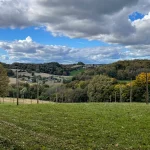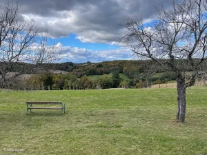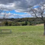 Begleitet von einer schönen Aussicht erreiche ich kurze Zeit später auch den höchsten Punkt meiner Tour. Hier, am „Gipfel“ des ersten Anstiegs breitet sich nördlich das Tal unter mir, mit seinen gegenüber liegenden Hügeln, aus. Ein tolles Panorama. Auch eine Bank, zum Rasten und sinnieren, oder um einfach die Aussicht zu genießen, ist hier prominent platziert.