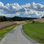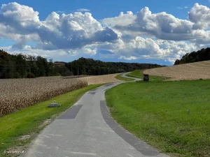 Hier geht’s nun wieder angenehm über ein weitgehend flaches, geschwungenes Asphaltband dahin, dass sich hier, parallel zur Bundesstraße, nahtlos in die schöne Landschaft ringsum einfügt. Vorbei an vereinzelt stehenden Häusern. Durch das Tal Richtung Eltendorf. Nach wie vor bei malerischer Kulisse.