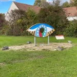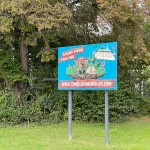 Jetzt noch die Bundesstraße überqueren und ich „habe fertig“ für heute. An der Kreuzung entdecke ich eine weitere Station des zuvor erwähnten Wanderwegs. Das „Auge“. Klingt interessant. Ja, diesen Weg will ich unbedingt noch gehen. Und ein Werbeschild fällt mir hier auch ins „Auge“. Ironisch, oder nicht?!