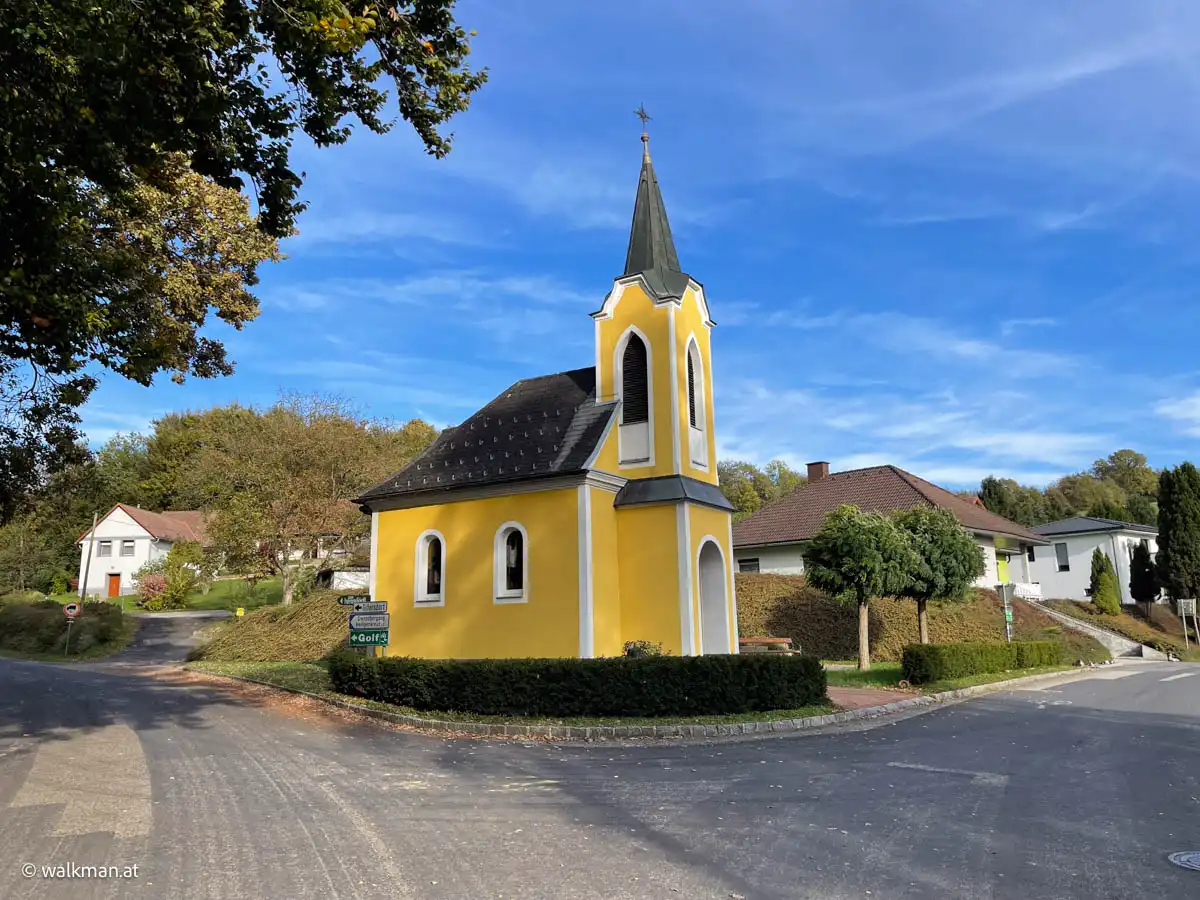 Von der „Hirczy-Kapelle“, so der Name dieses schmucken kleinen „Kirchleins“, weg, marschierte ich zunächst nach Südosten. Die Straße hier ist nicht näher betitelt. Wie so oft werden die Adressen einfach mit „Ober-Henndorf“ mit einer Nummer hinten dran angegeben.